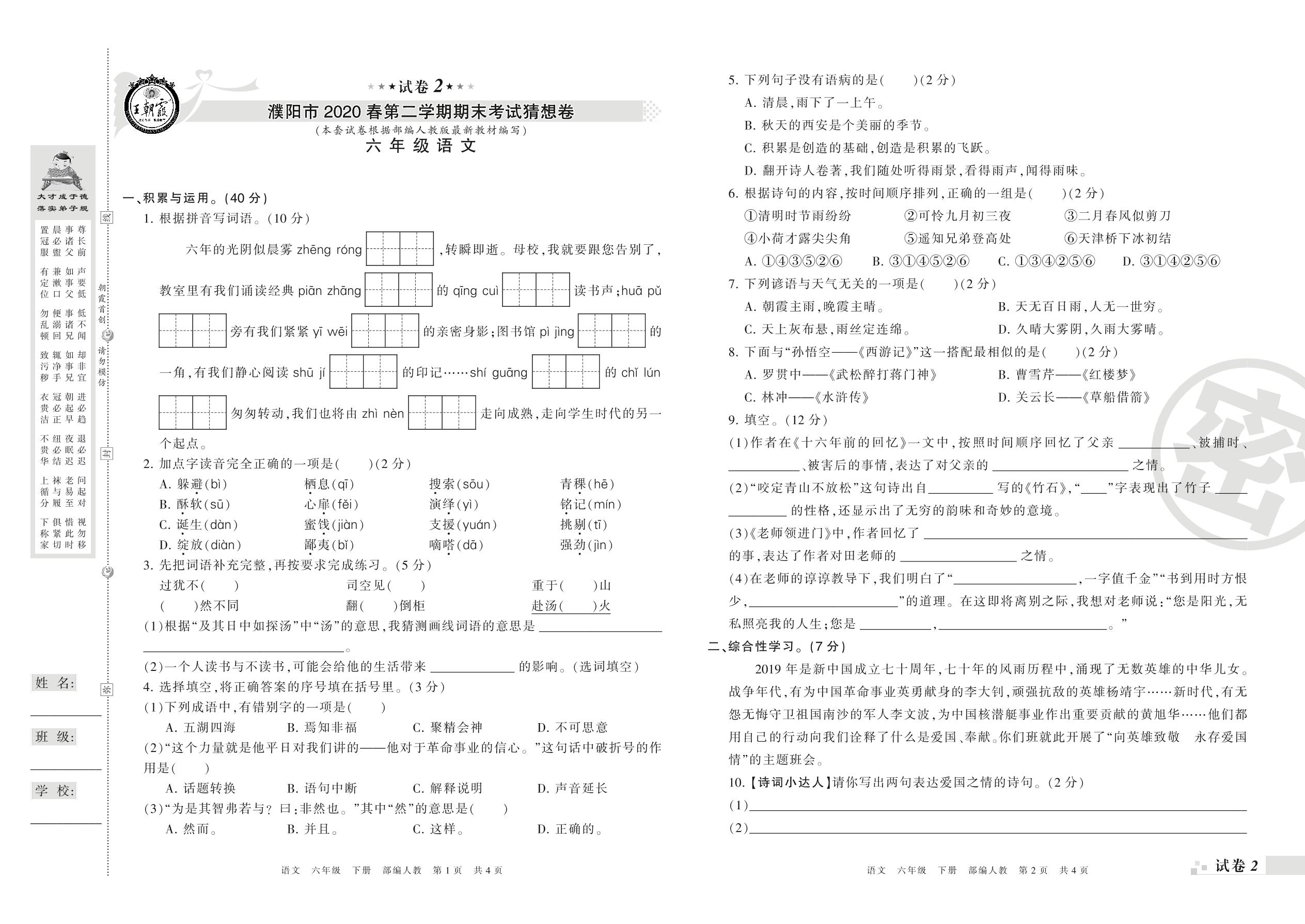 2018-2019学年第二学期濮阳市猜想卷六年级语文试卷(人教版)【2】