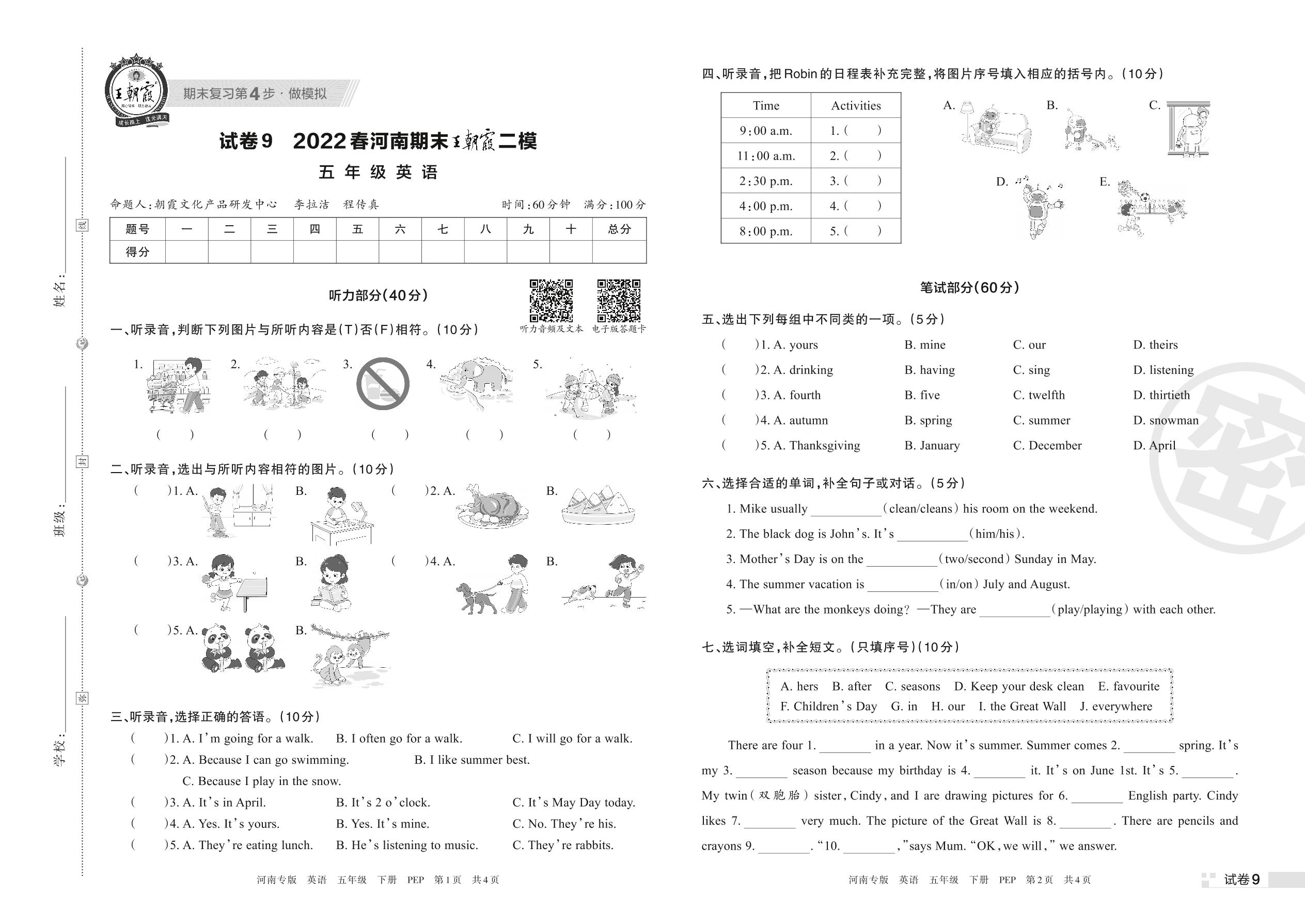 王朝霞期末模拟卷五年级下册英语(PEP版)_R220331100219396【9】