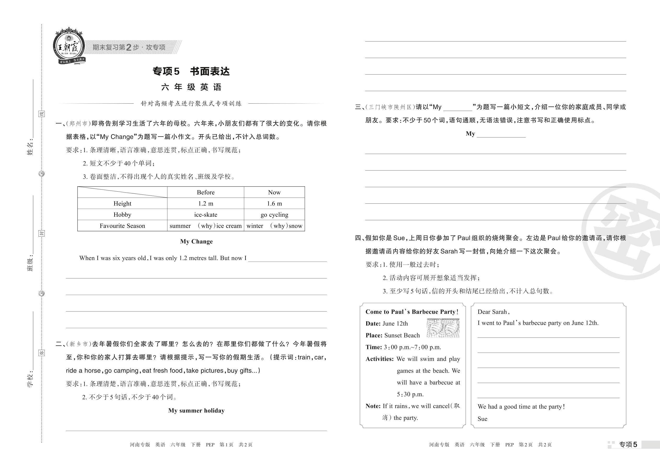 王朝霞期末专项卷——书面表达六年级下册英语(PEP版)_R220331101256136【5】