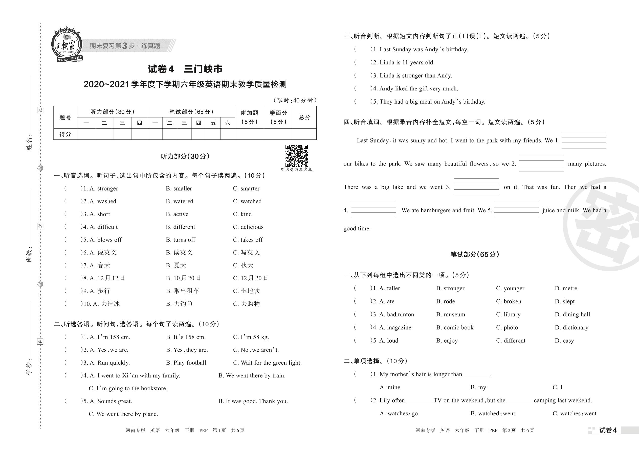 三门峡市2020~2021学年度下学期六年级英语期末教学质量检测(PEP版)【4】