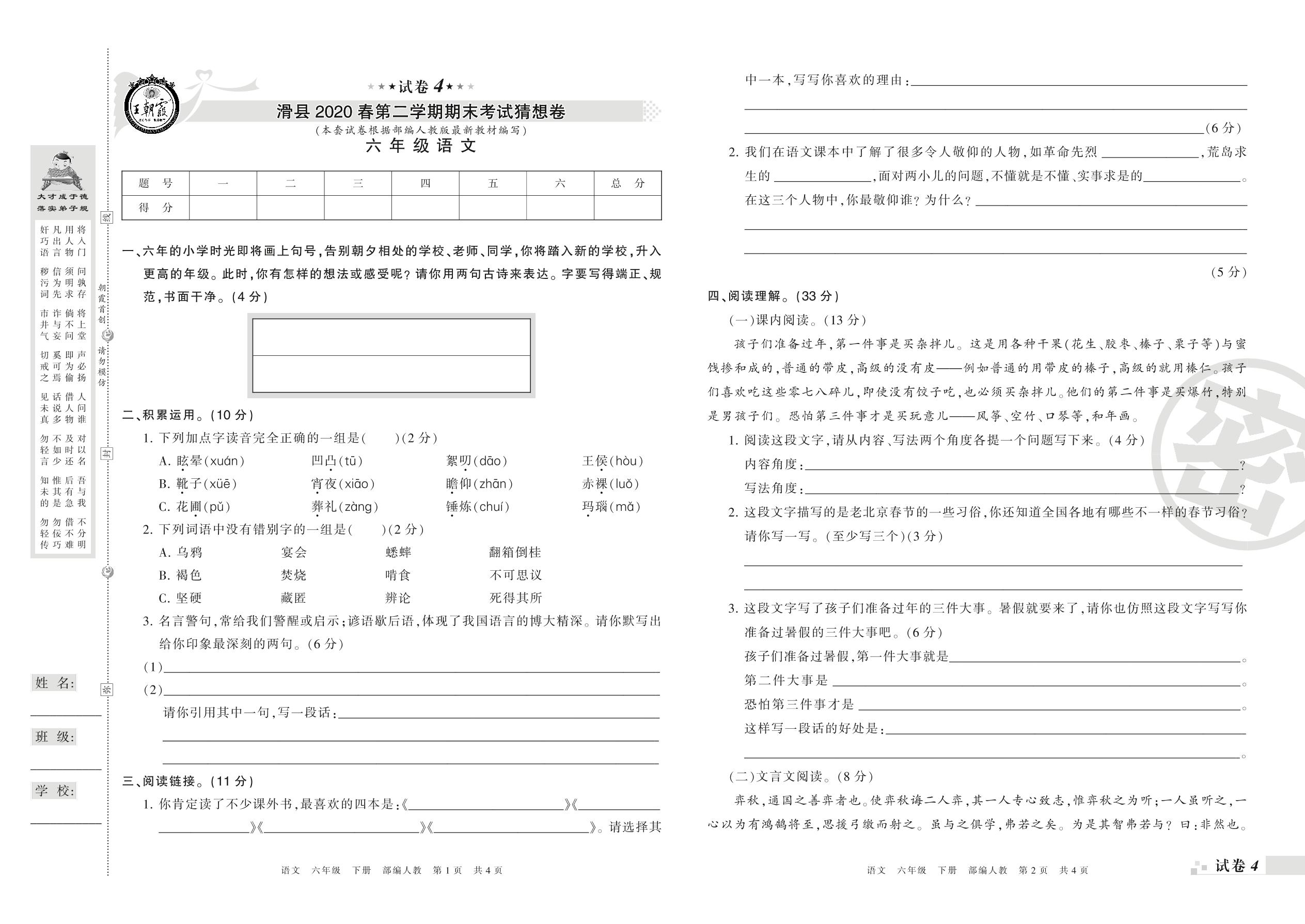 2018-2019学年第二学期安阳市滑县猜想卷六年级语文试卷(人教版)【4】