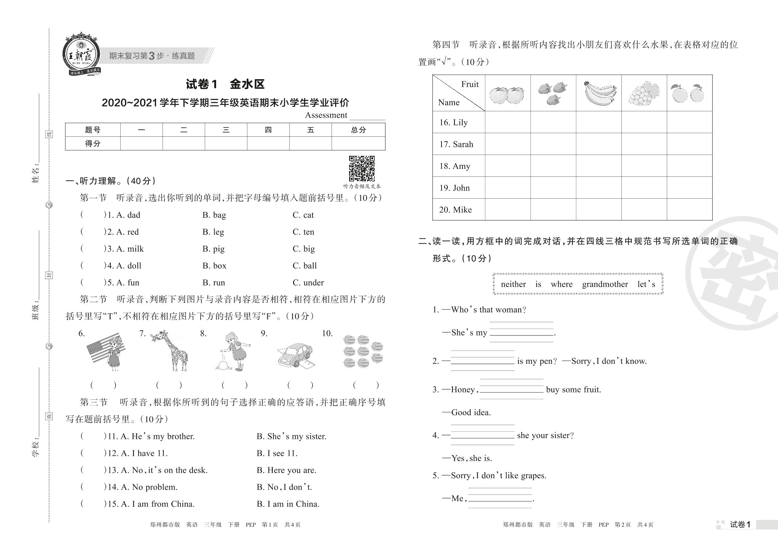 金水区2020~2021学年下学期三年级英语期末小学生学业评价(PEP版)【1】