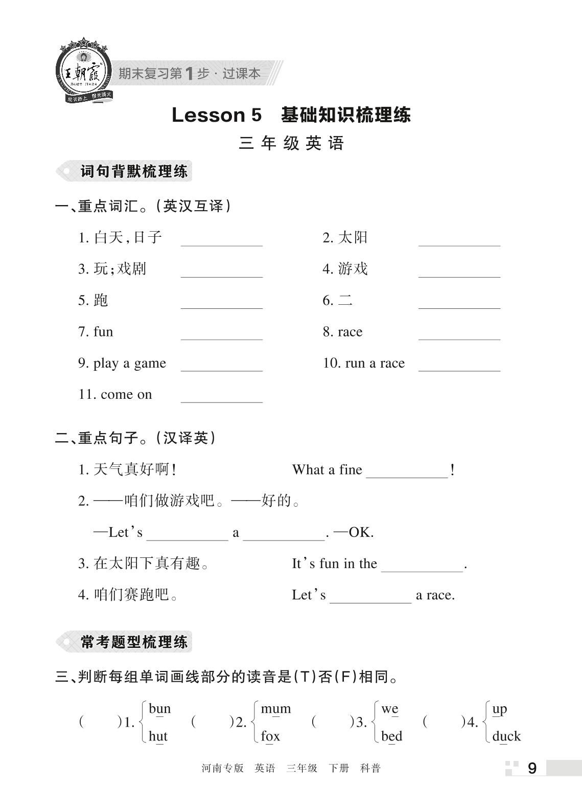 王朝霞期末过课本——Lessons 5 基础知识梳理练三年级下册英语(科普版)