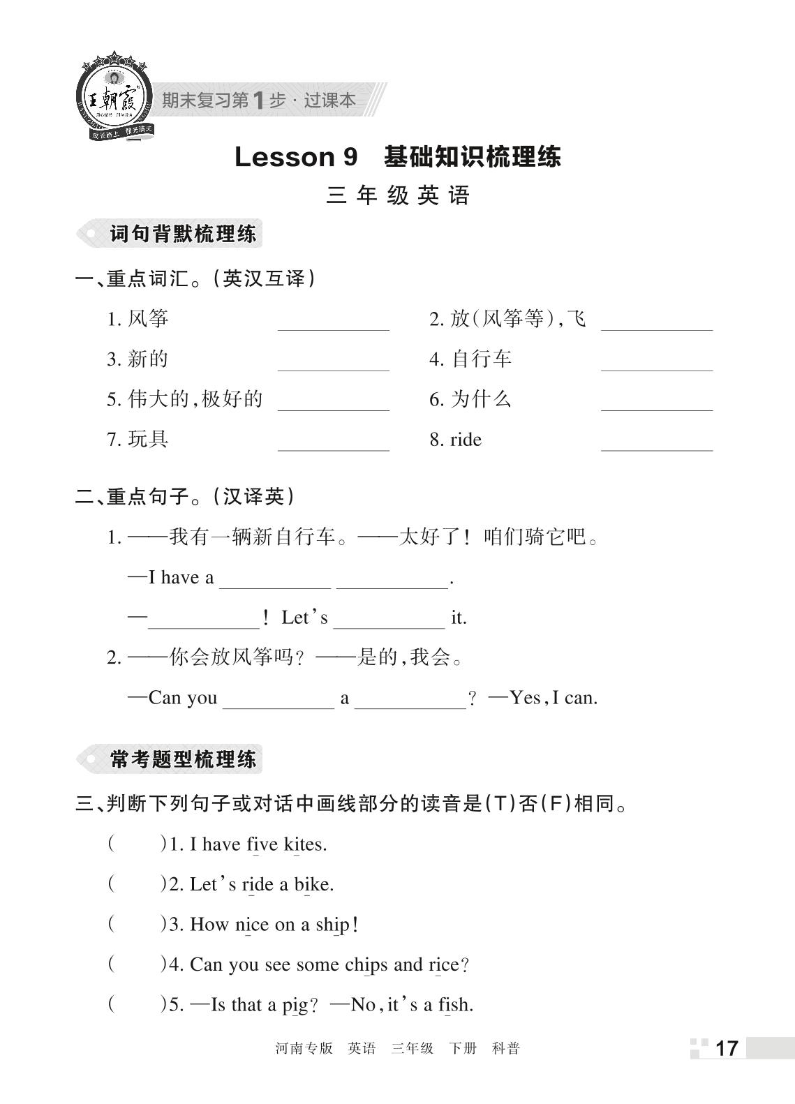 王朝霞期末过课本——Lessons 9 基础知识梳理练三年级下册英语(科普版)