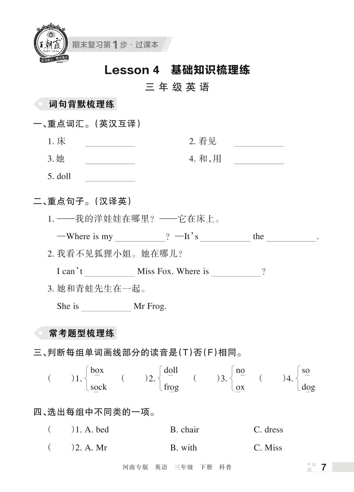 王朝霞期末过课本——Lessons 4 基础知识梳理练三年级下册英语(科普版)