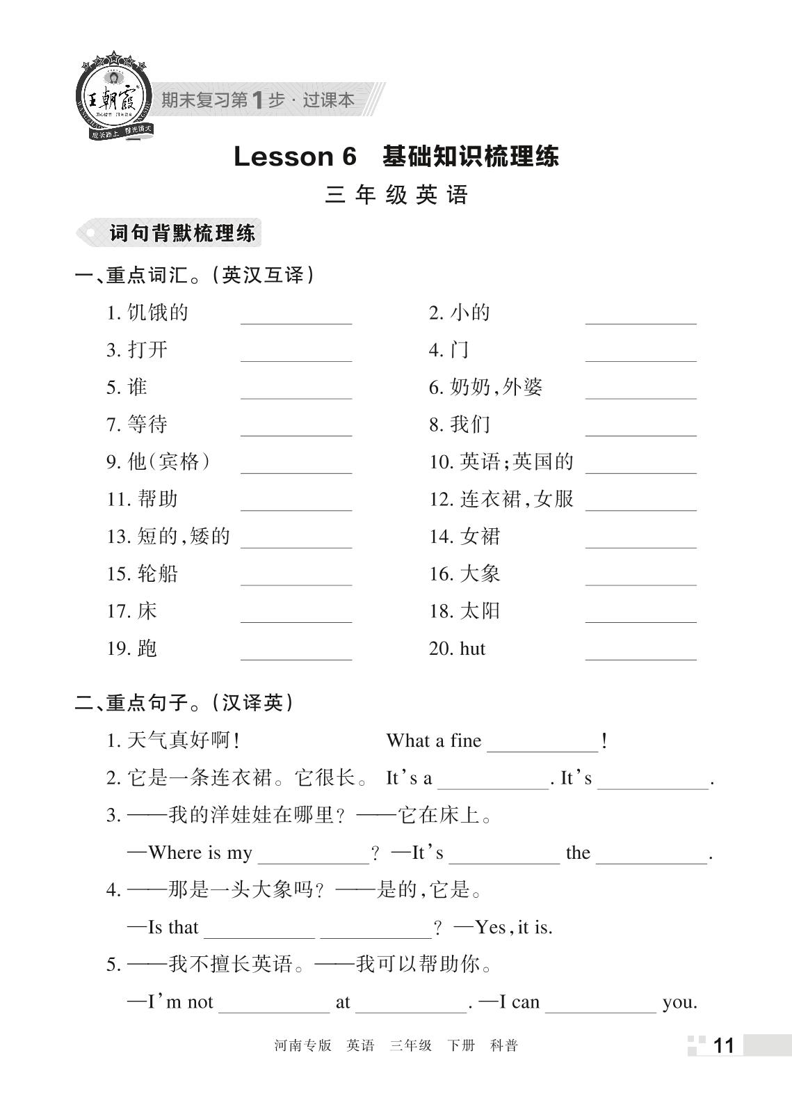 王朝霞期末过课本——Lessons 6 基础知识梳理练三年级下册英语(科普版)