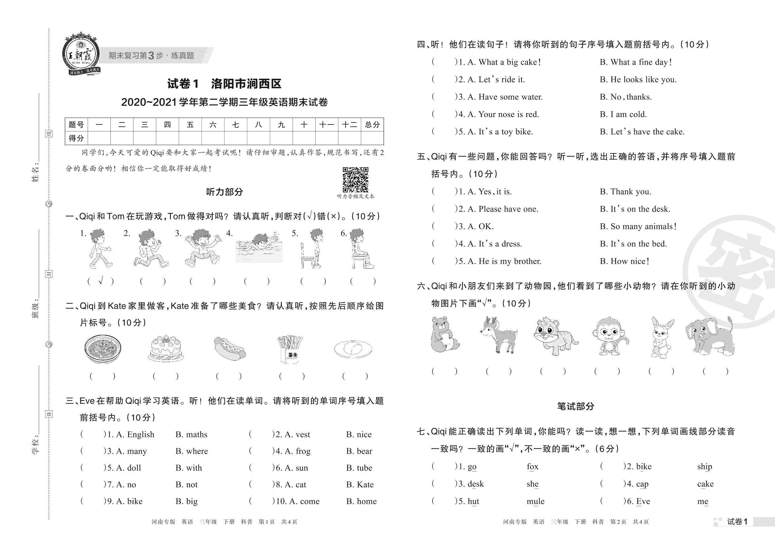 洛阳市涧西区2020~2021学年第二学期三年级英语期末试卷(科普版)【1】