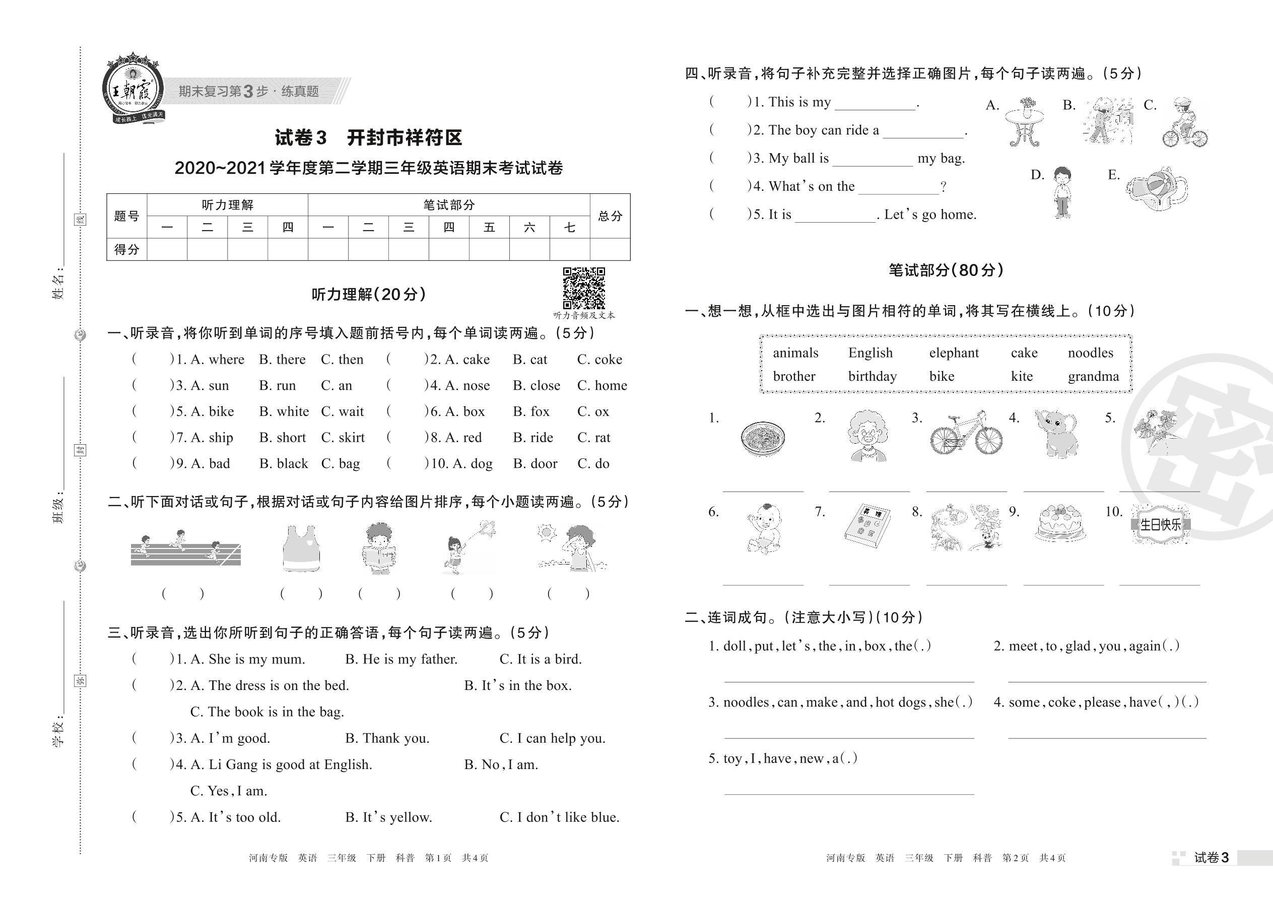 开封市祥符区2020~2021学年度第二学期三年级英语期末考试试卷(科普版)【3】