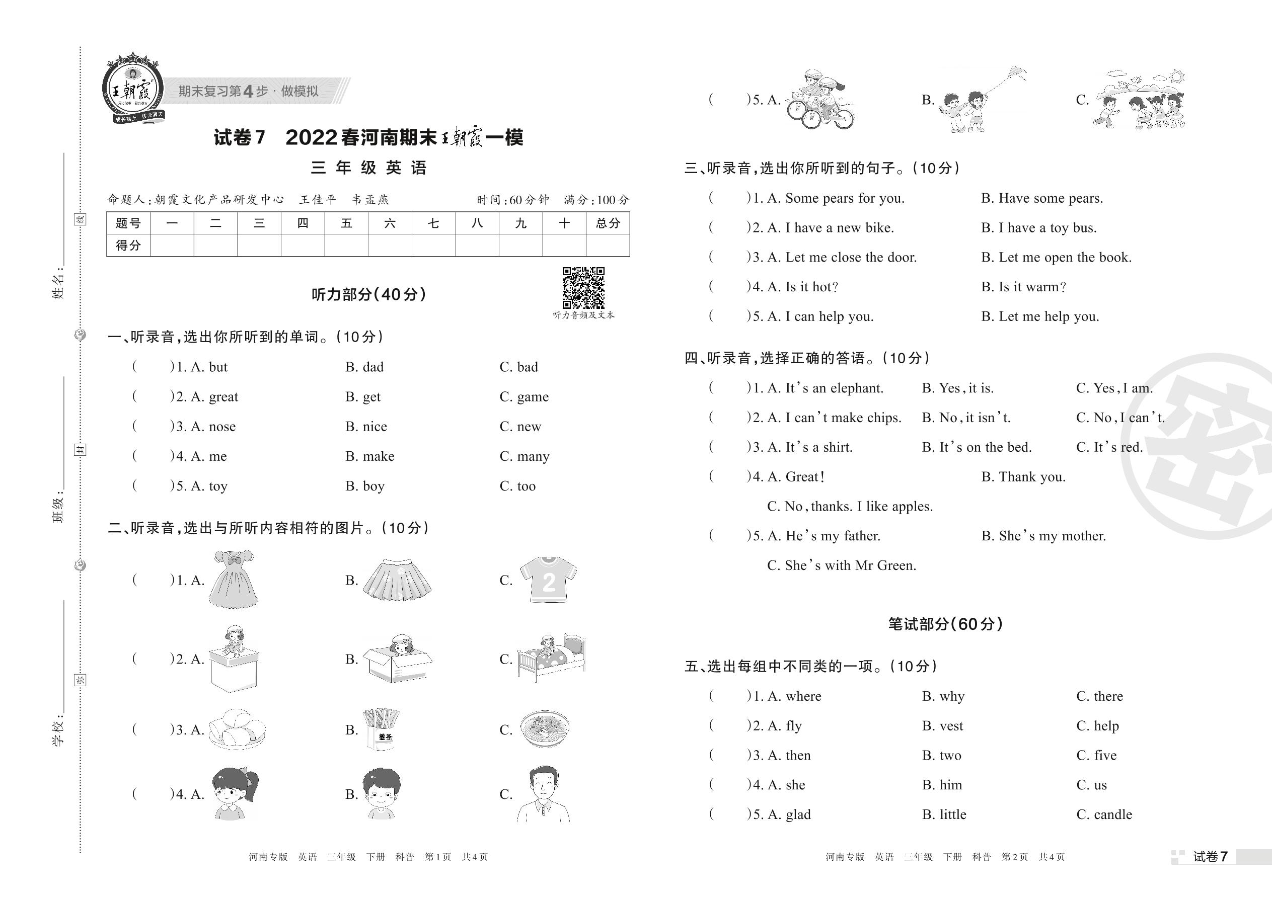 王朝霞期末模拟卷三年级下册英语(科普版)【7】