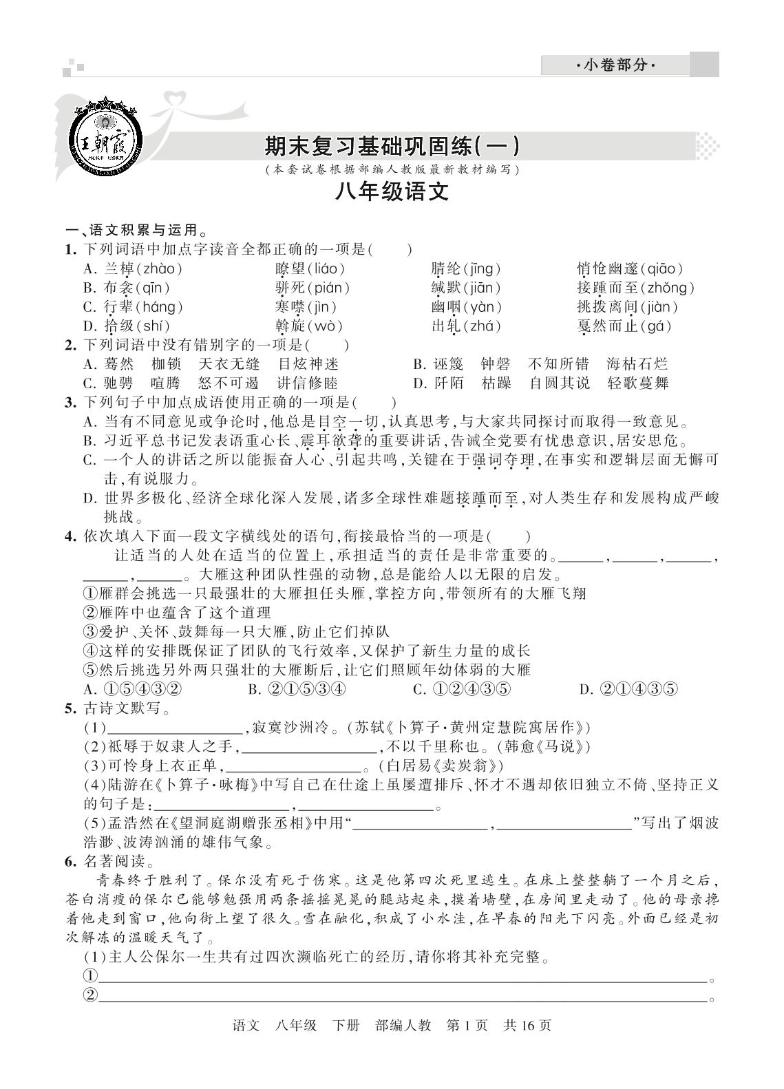 王朝霞期末小卷——期末复习基础巩固练八年级下册语文(人教版)_R21080215812【0】