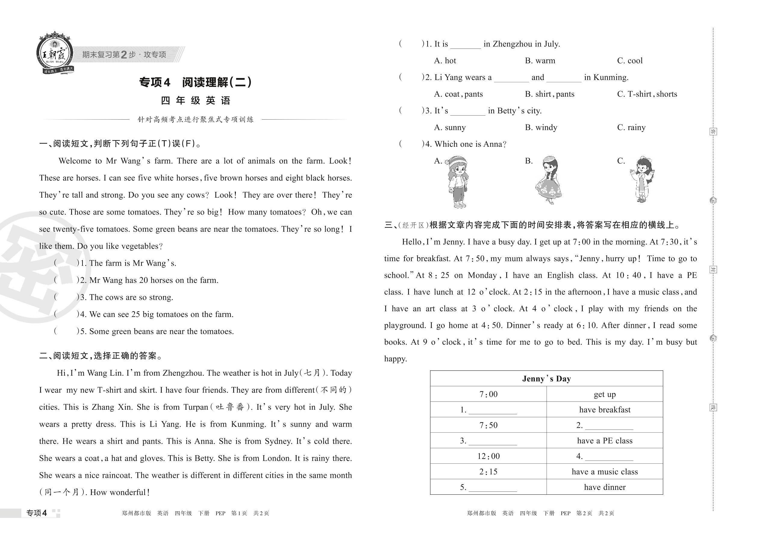 王朝霞期末专项卷——阅读理解(二)四年级下册英语(PEP版)【4】