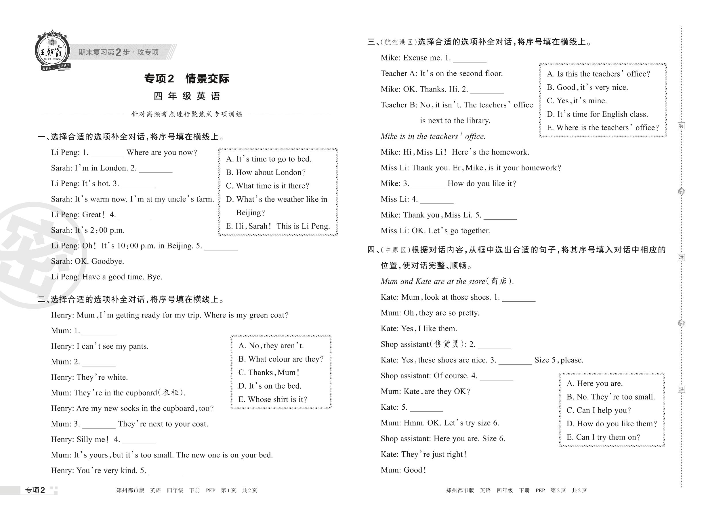 王朝霞期末专项卷——情景交际四年级下册英语(PEP版)【2】