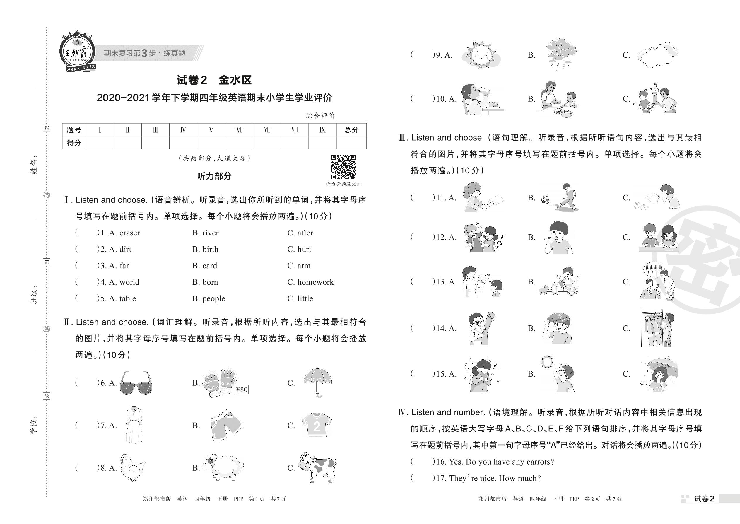 金水区2020~2021学年下学期四年级英语期末小学生学业评价(PEP版)【2】