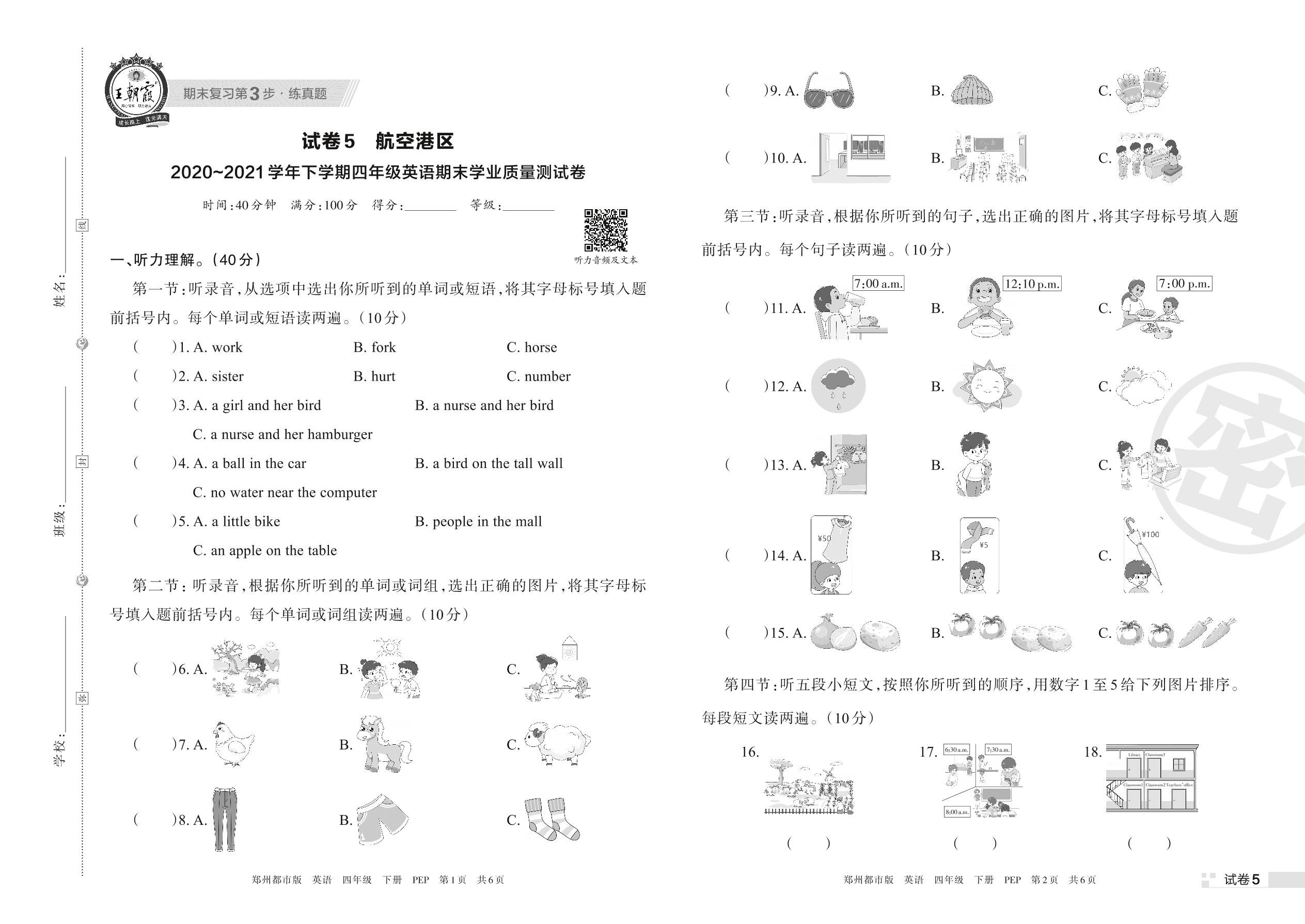 四年级英语人教PEP版(三起始)下册期末卷