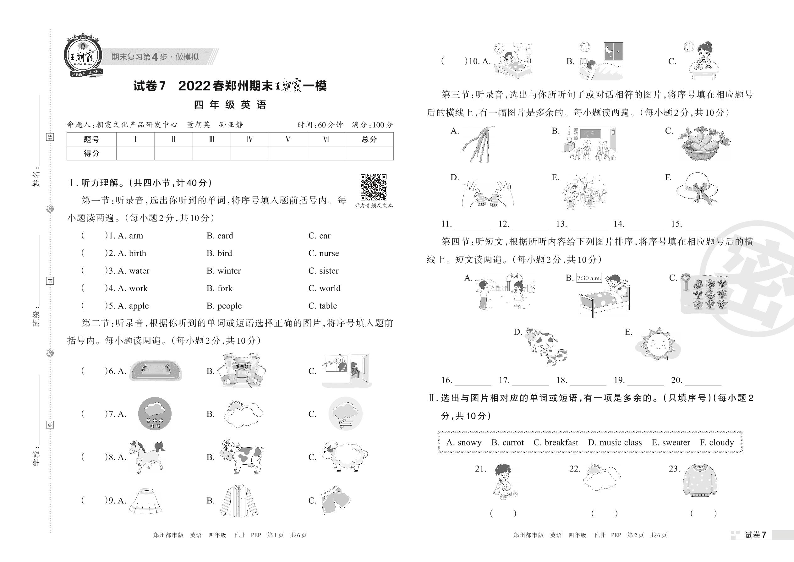 王朝霞期末模拟卷四年级下册英语(PEP版)_R220331102504095【7】