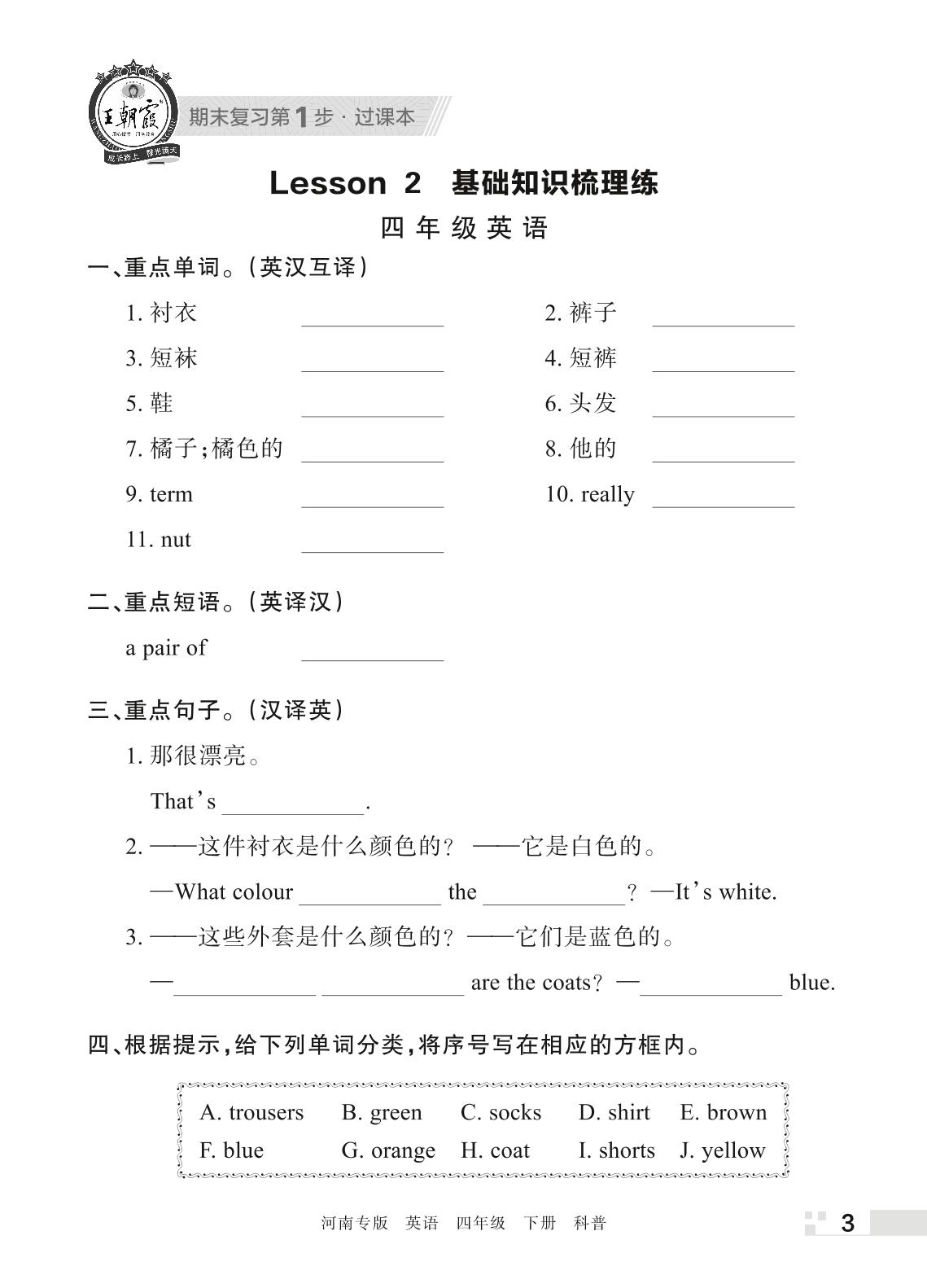 王朝霞期末过课本——Lessons 2 基础知识梳理练四年级下册英语(科普版)