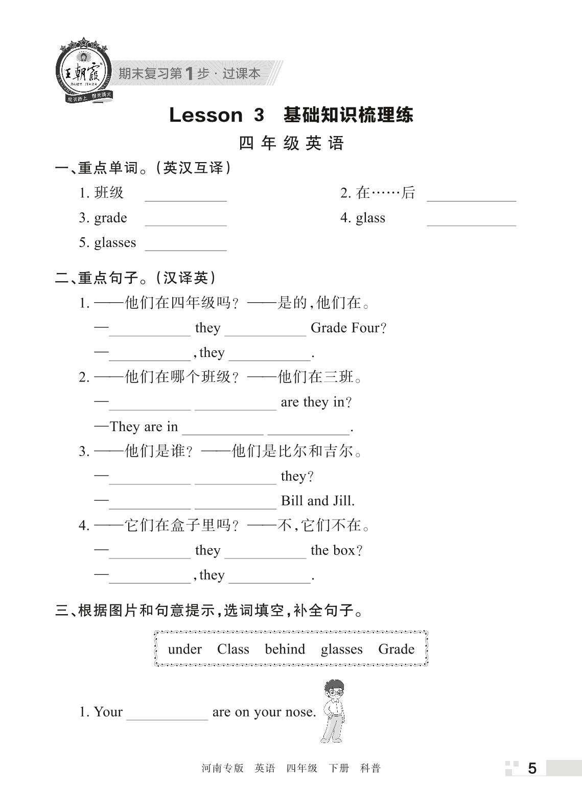 王朝霞期末过课本——Lessons 3 基础知识梳理练四年级下册英语(科普版)