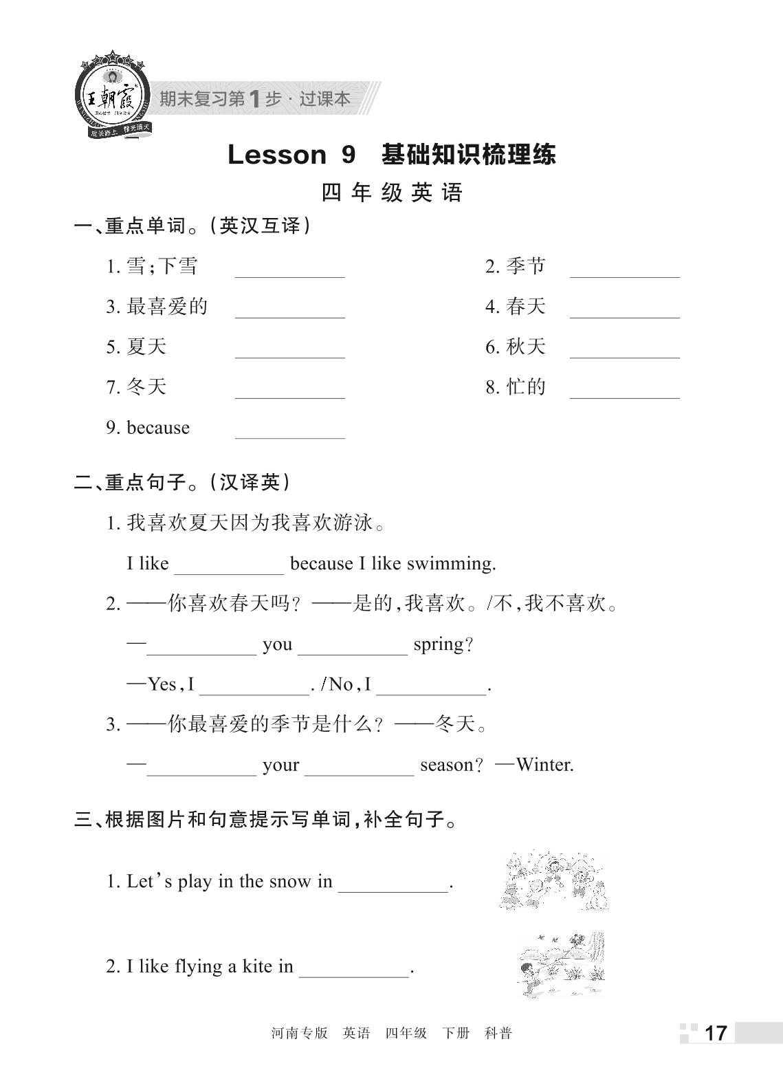 王朝霞期末过课本——Lessons 9 基础知识梳理练四年级下册英语(科普版)