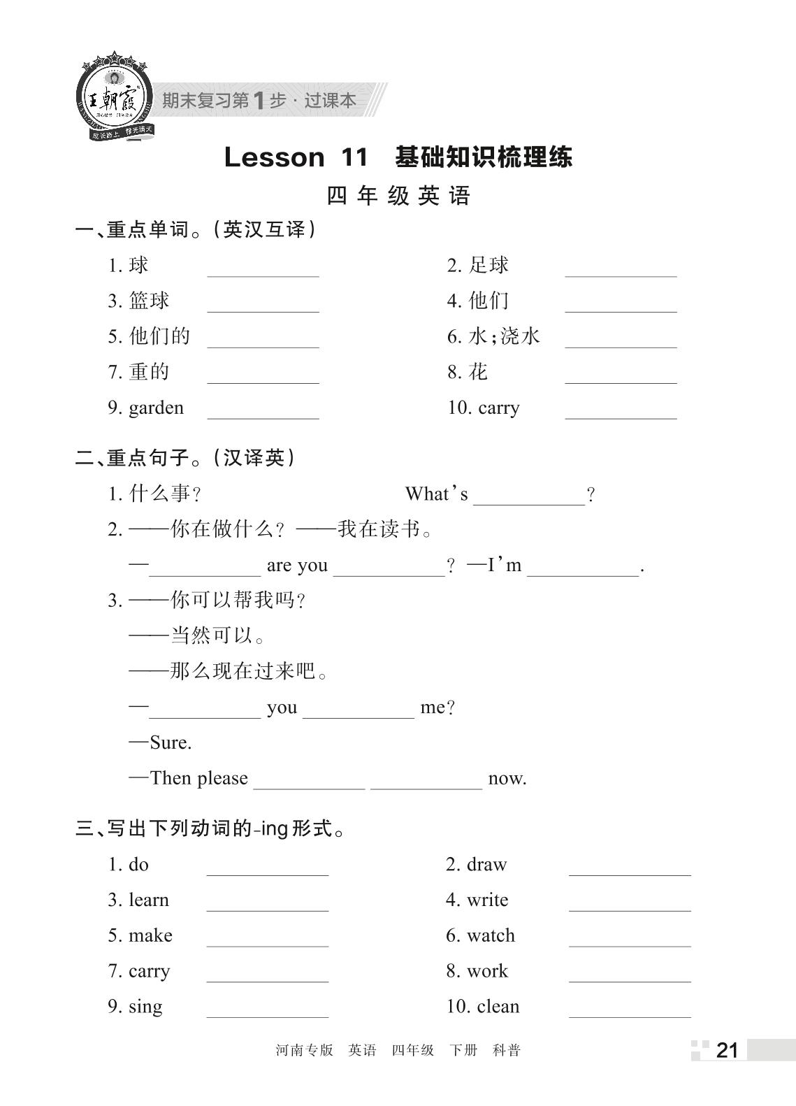 王朝霞期末过课本——Lessons 11 基础知识梳理练四年级下册英语(科普版)