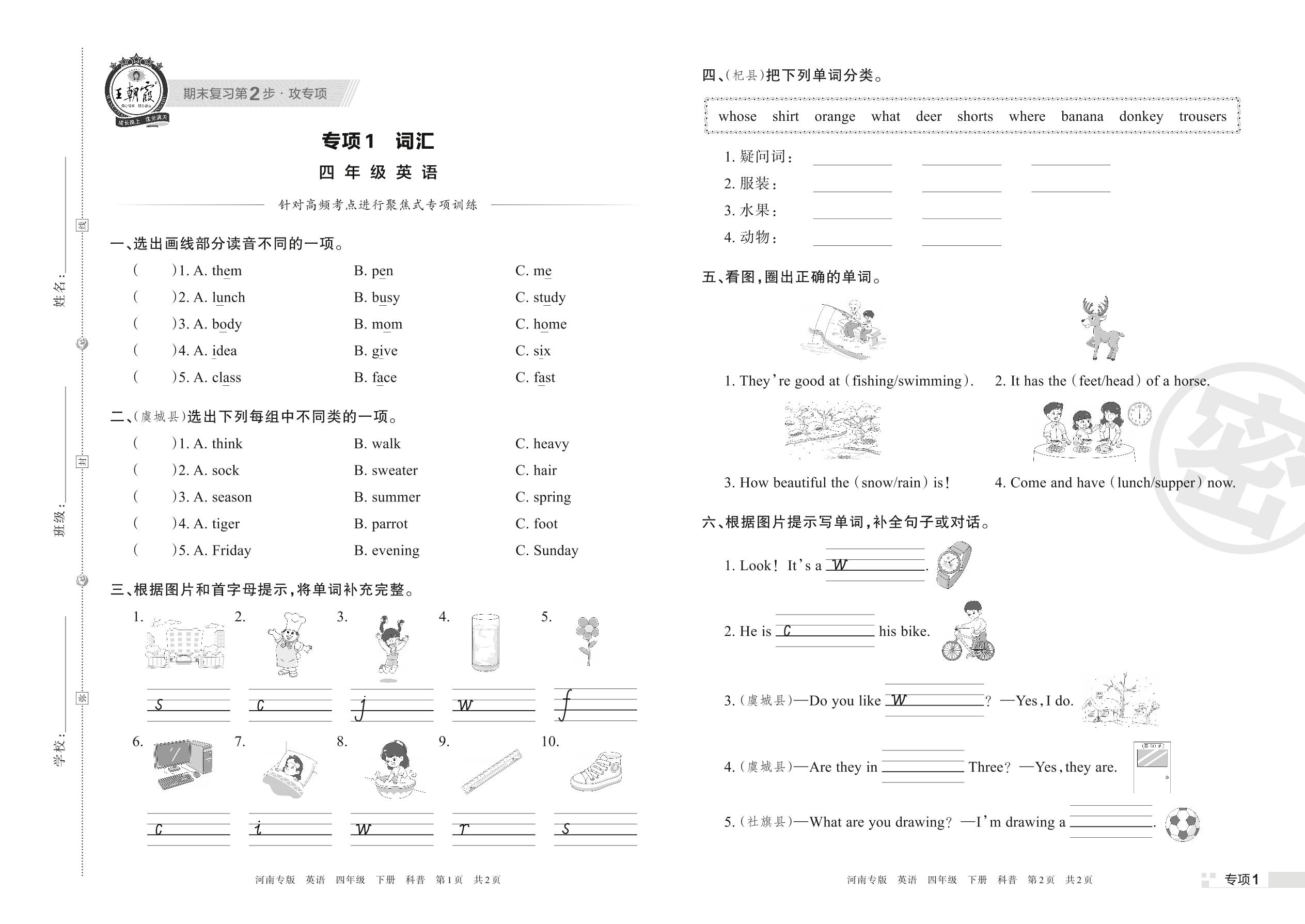 王朝霞期末专项卷——词汇四年级下册英语(科普版)【1】