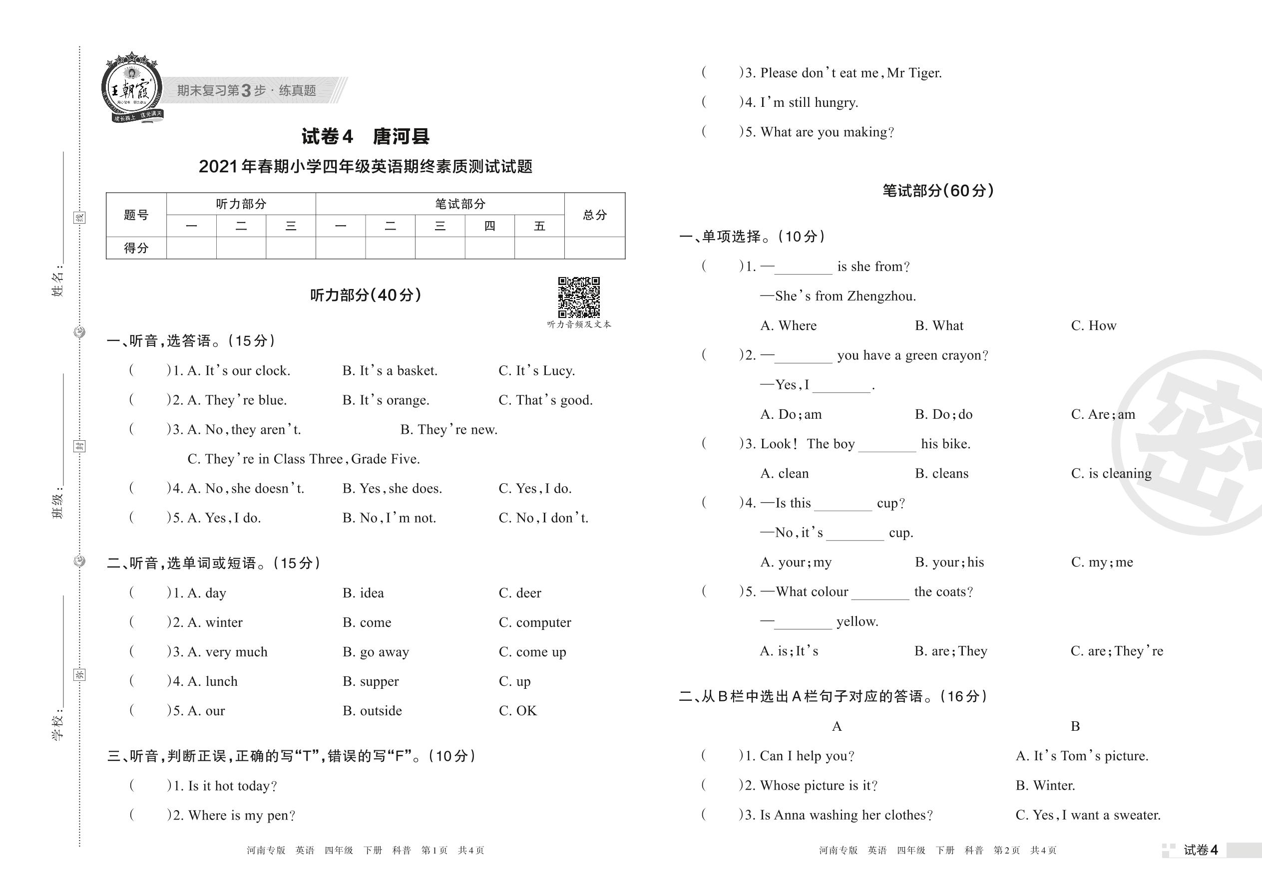 四年级英语科普版下册期末卷