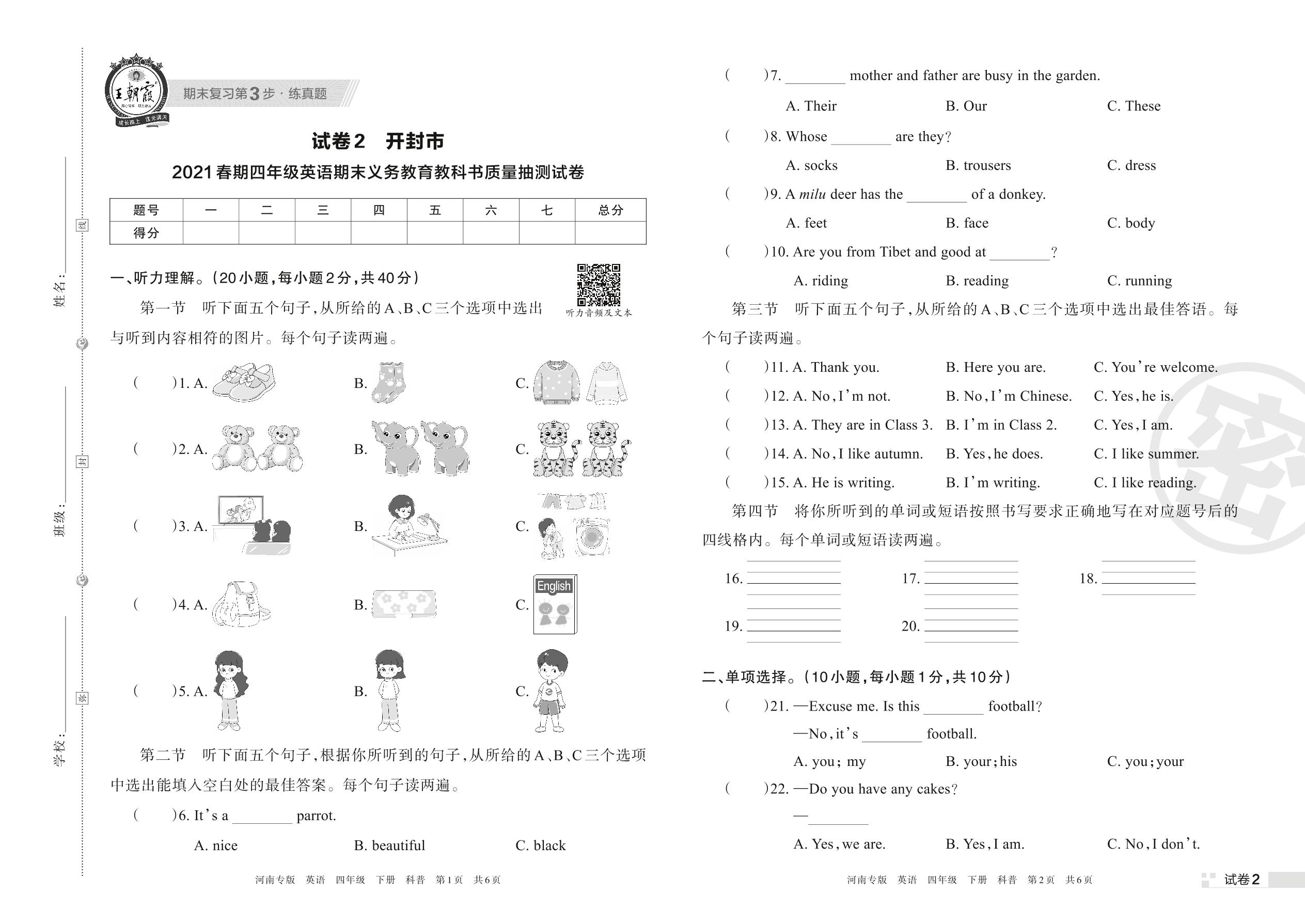开封市2021春期四年级英语期末义务教育教科书质量抽测试卷(科普版)【2】