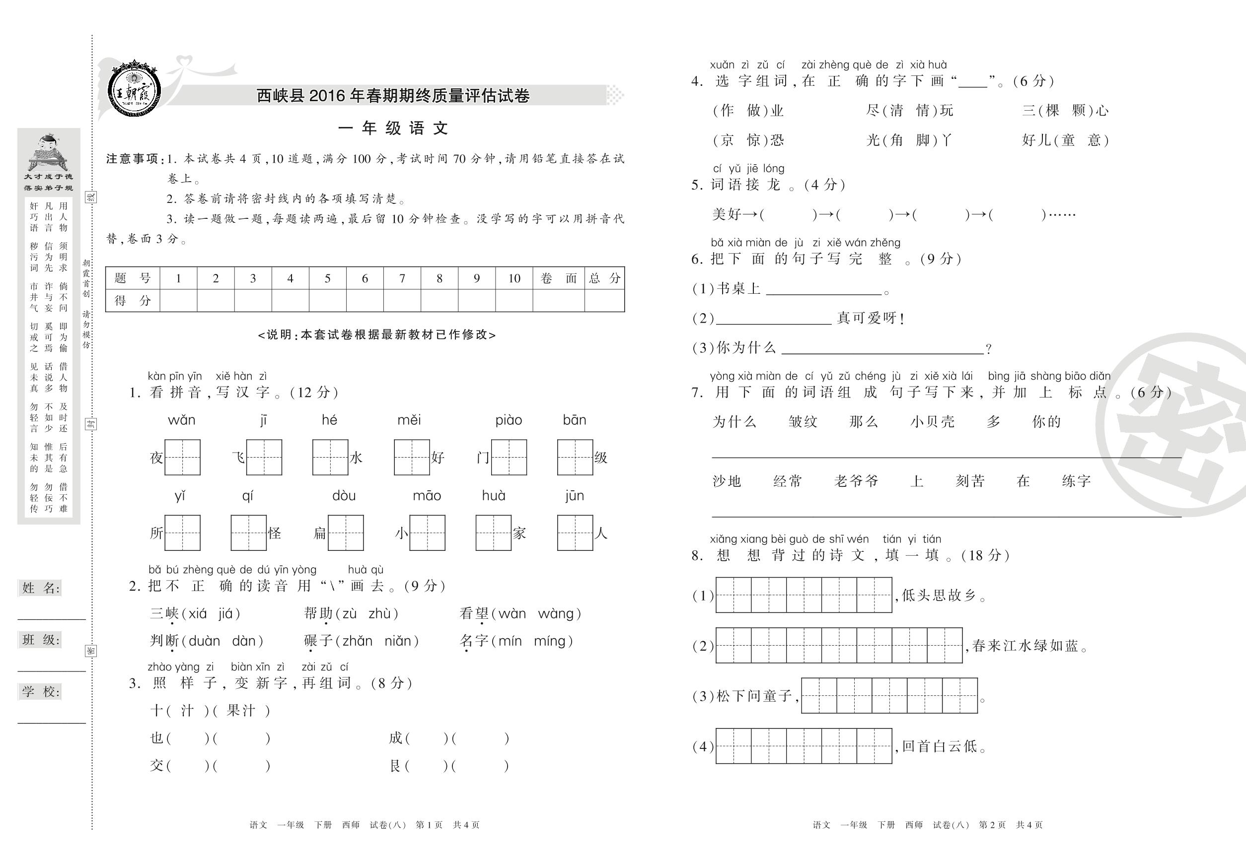 2015-2016学年第二学期南阳市西峡县一年级语文试卷(西师版)【8】