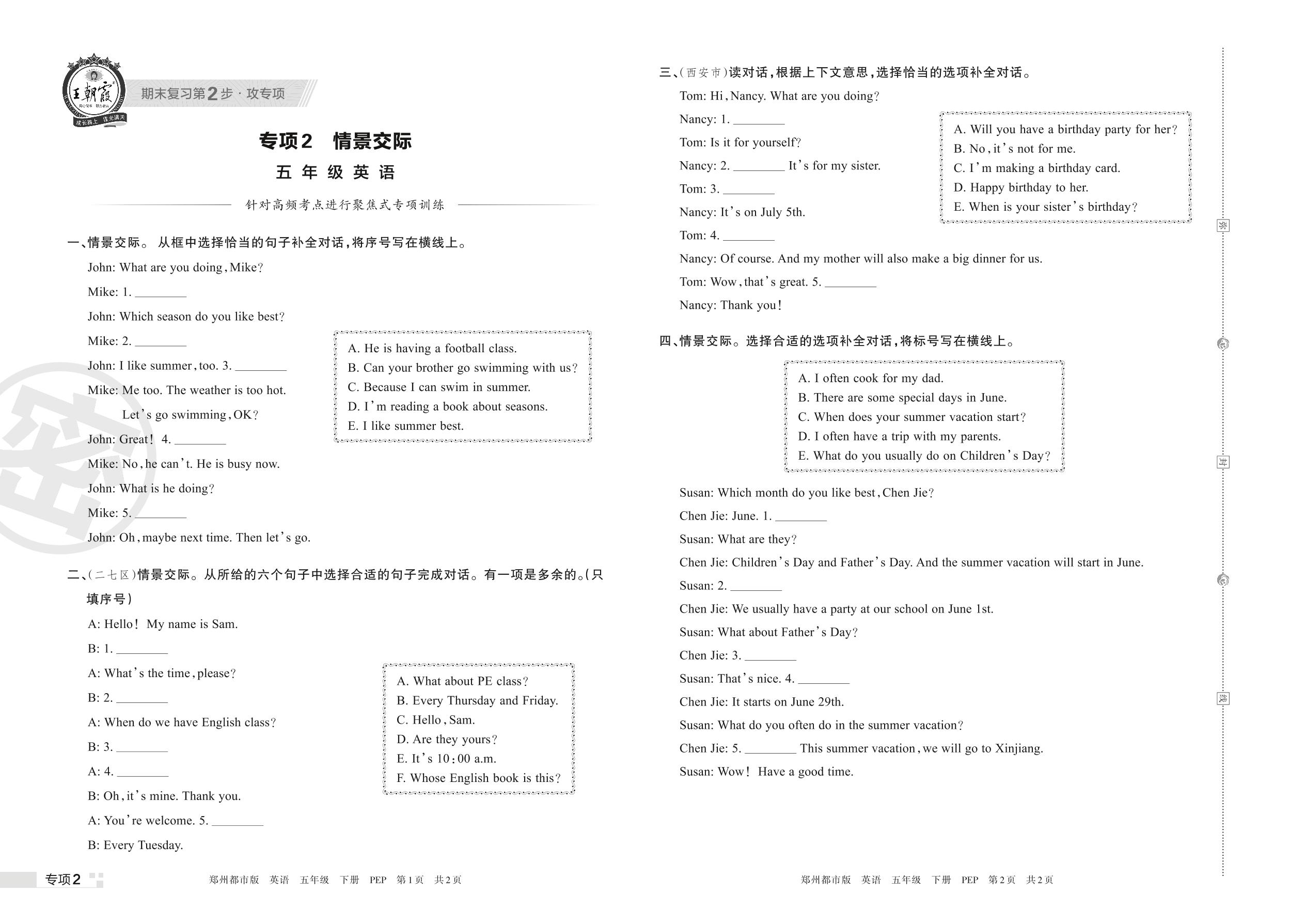 王朝霞期末专项卷——情景交际五年级下册英语(PEP版)_R220331103305602【2】