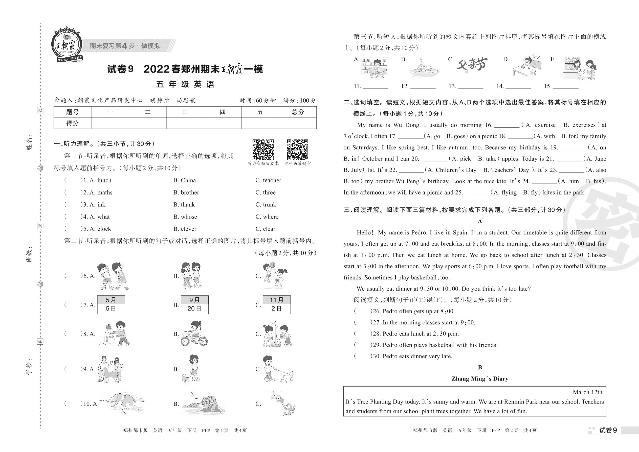 王朝霞期末模拟卷五年级下册英语(PEP版)_R220331103307115【9】