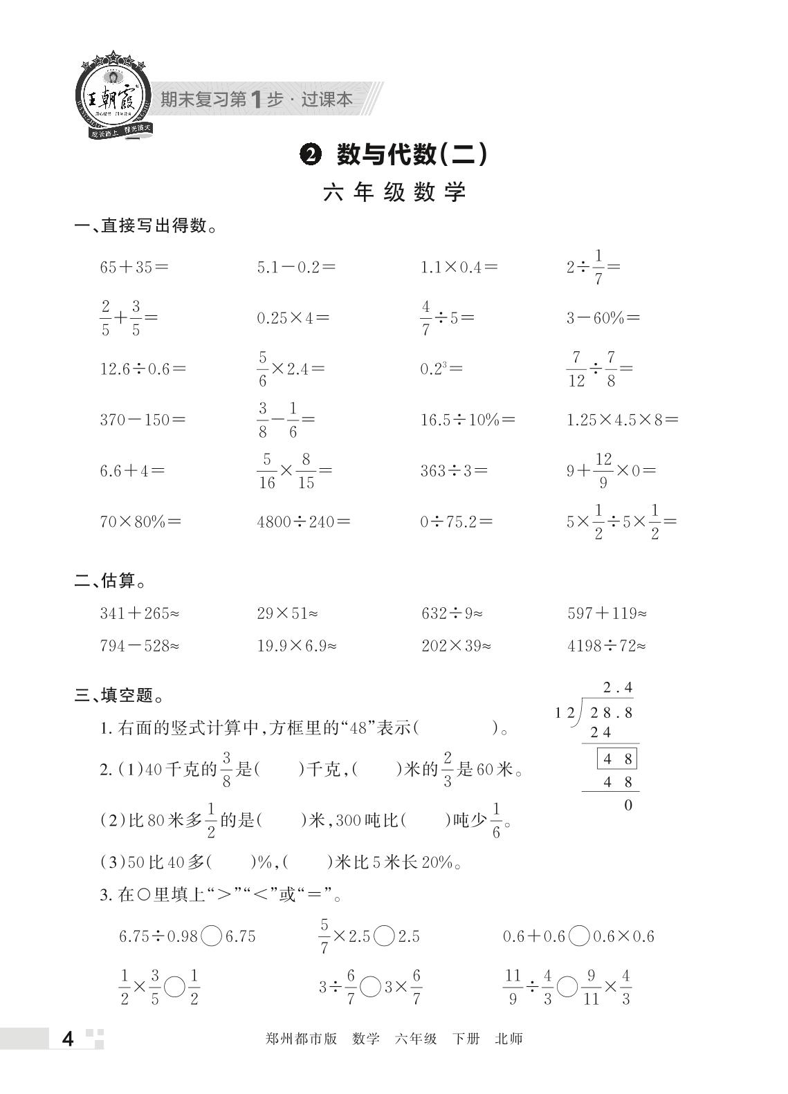 王朝霞期末过课本——2 数与代数(二)六年级下册数学(北师版)_R220331104004169