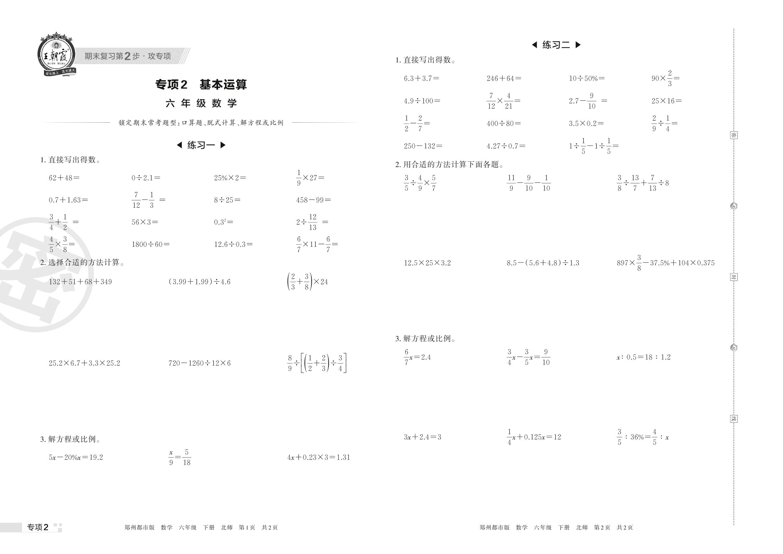 王朝霞期末专项卷——基本运算六年级下册数学(北师版)_R220331104005203【2】
