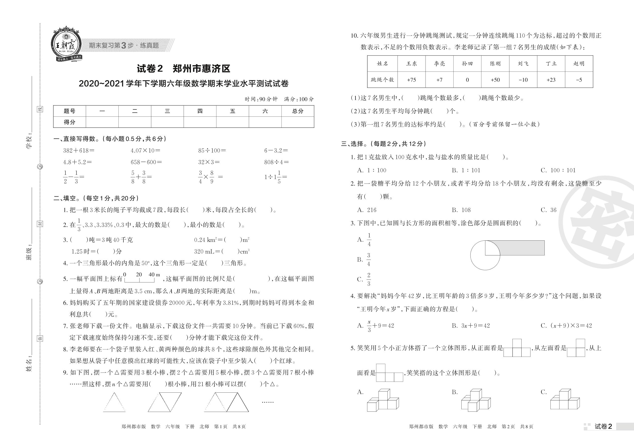 郑州市惠济区2020~2021学年下学期六年级数学期末学业水平测试试卷(北师版)【2】