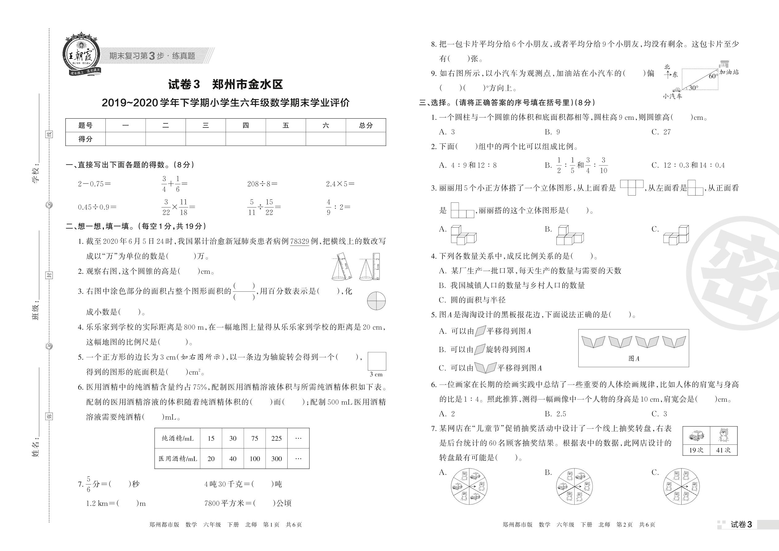 郑州市金水区2019~2020学年下学期小学生六年级数学期末学业评价(北师版)【3】