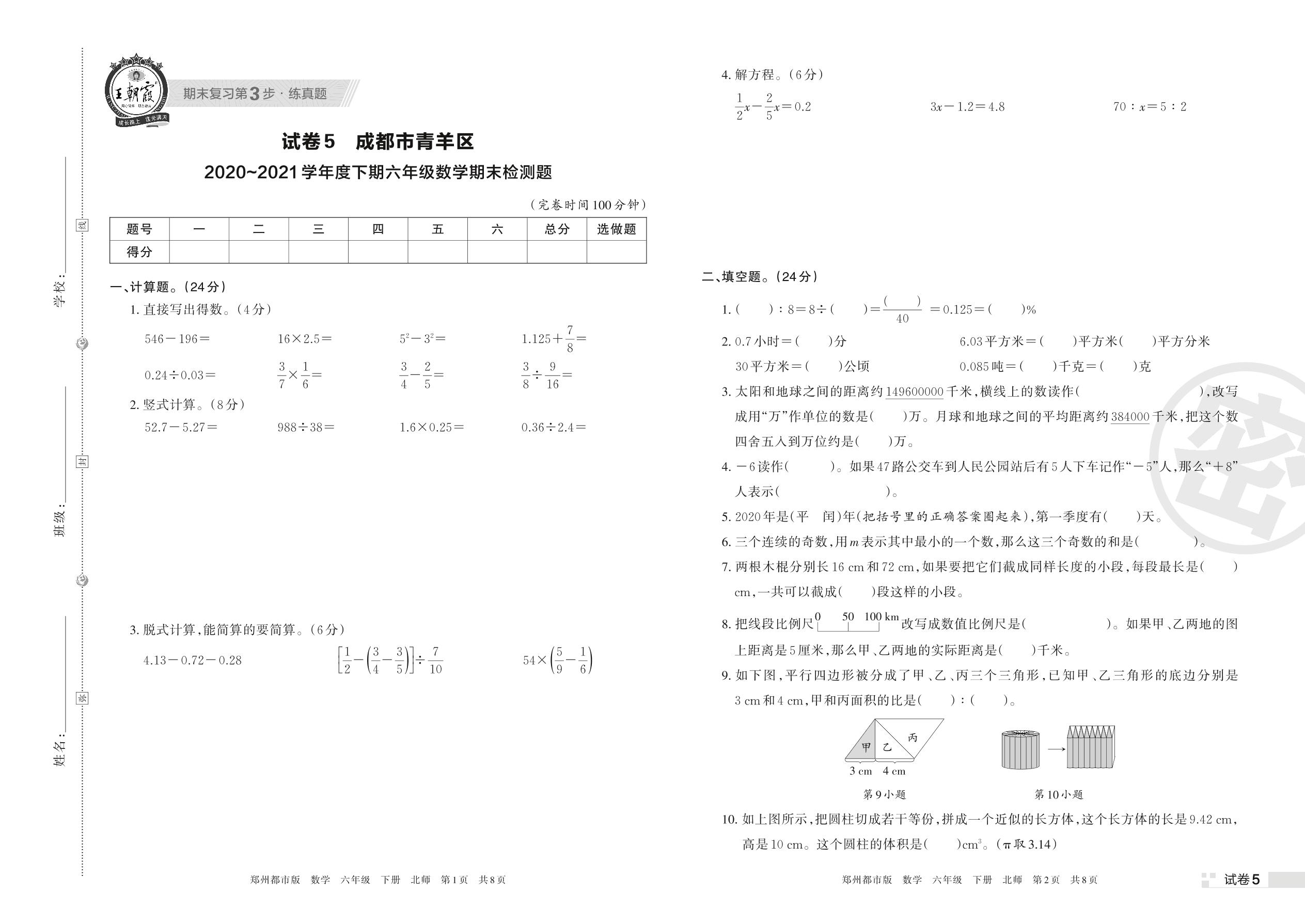 成都市青羊区2020~2021学年度下期六年级数学期末检测题(北师版)【5】