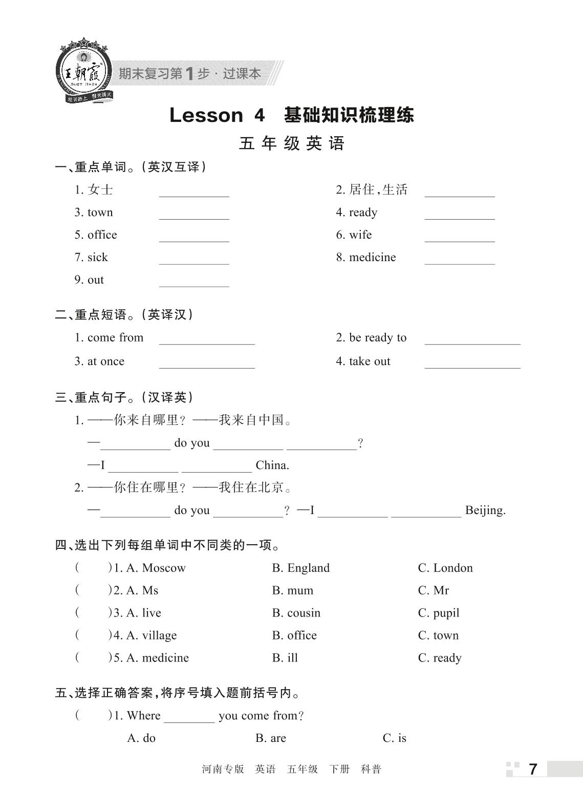 王朝霞期末过课本——Lessons 4 基础知识梳理练五年级下册英语(科普版)