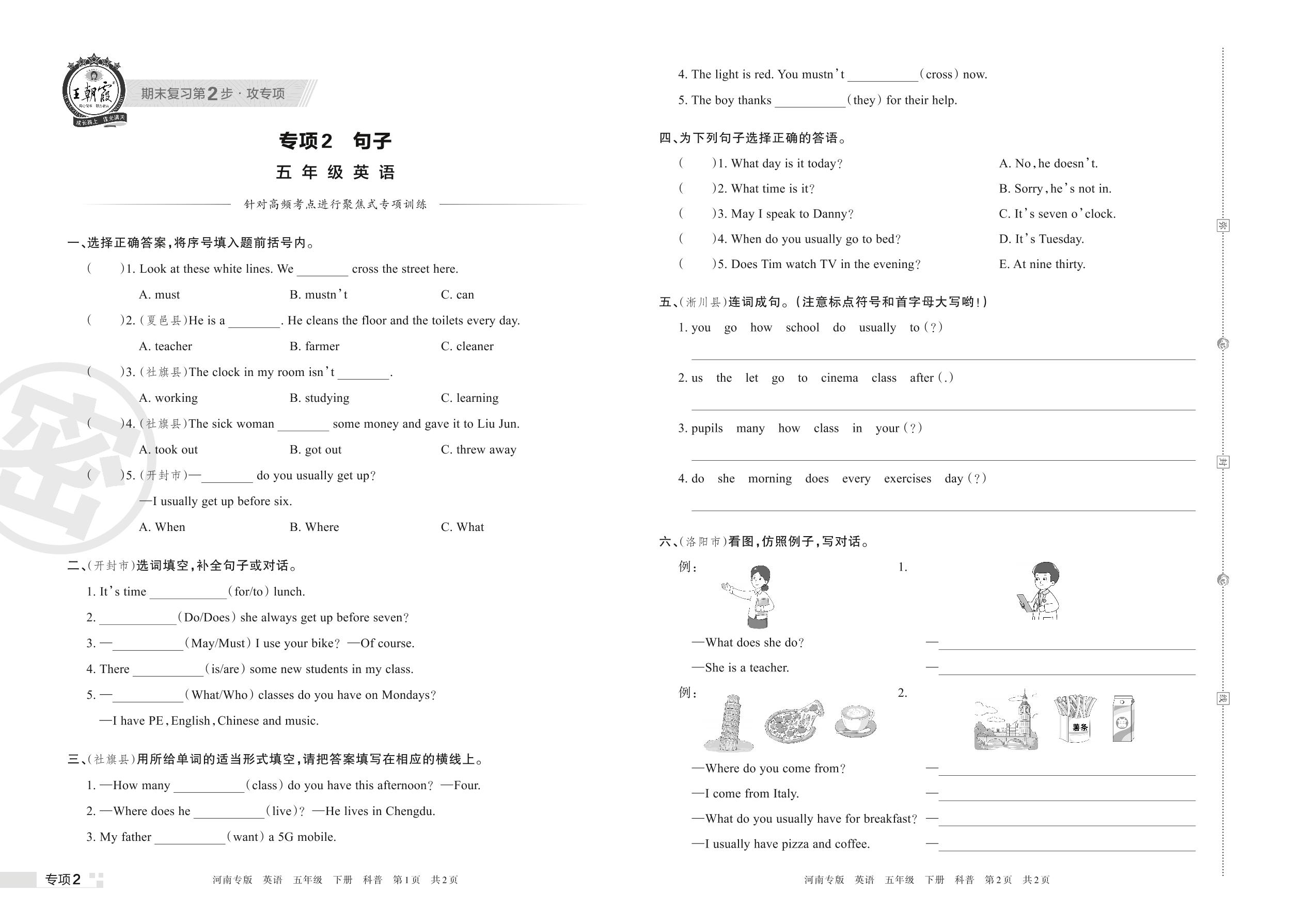 王朝霞期末专项卷——句子五年级下册英语(科普版)【2】