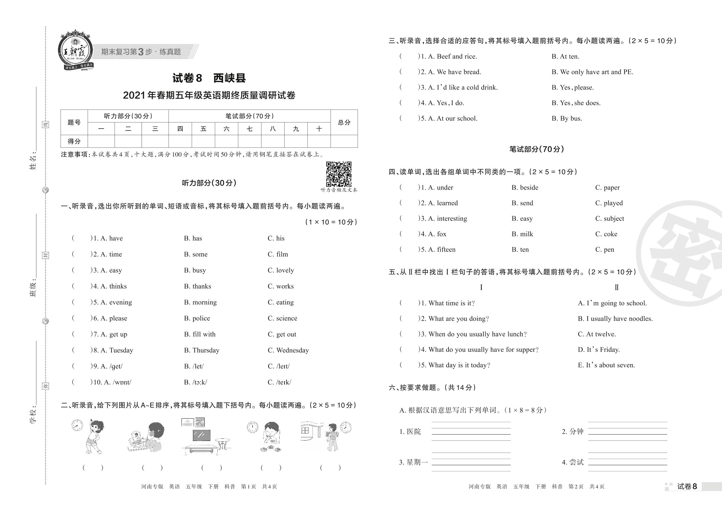西峡县2021年春期五年级英语期终质量调研试卷(科普版)【8】