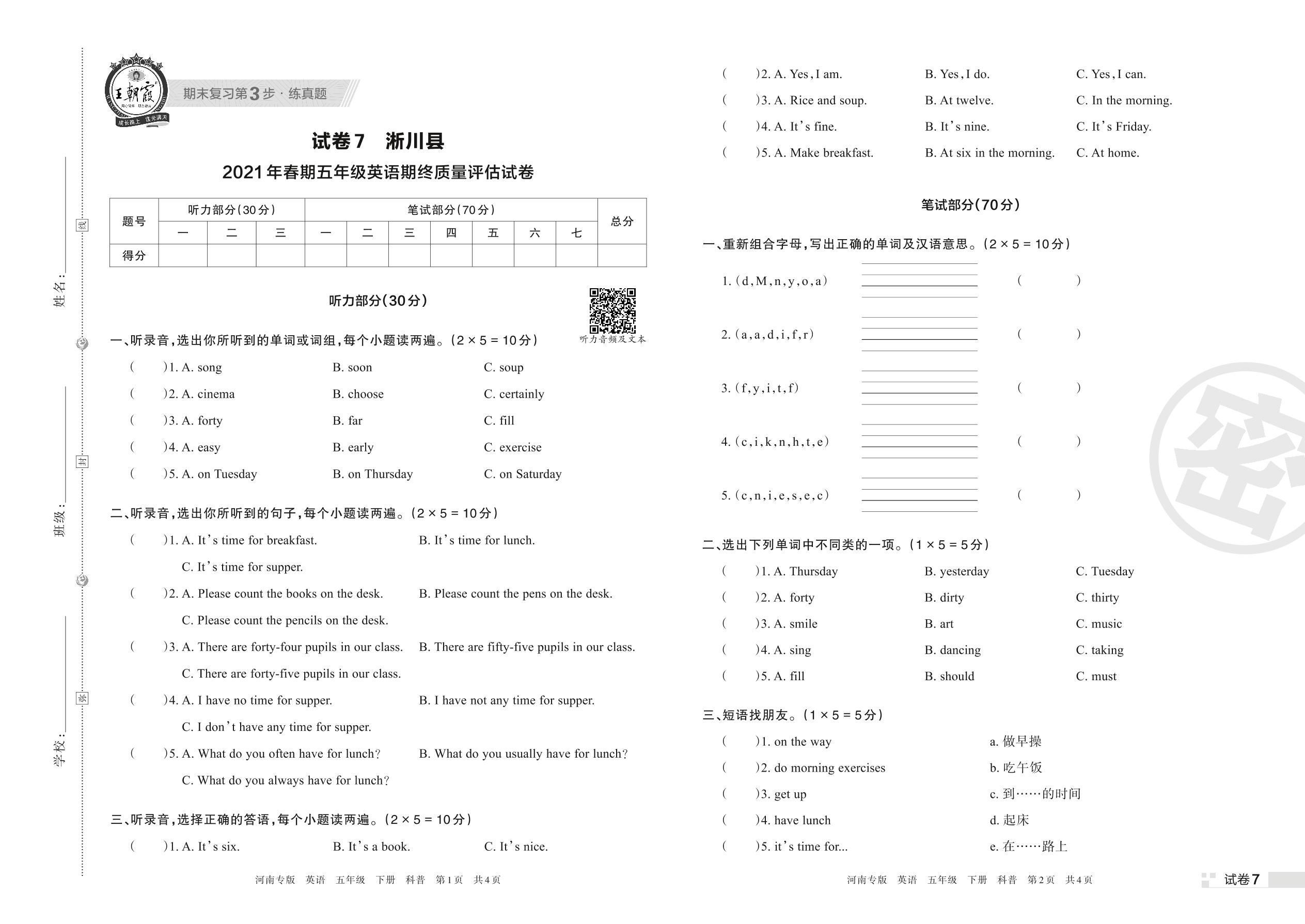 淅川县2021年春期五年级英语期终质量评估试卷(科普版)【7】