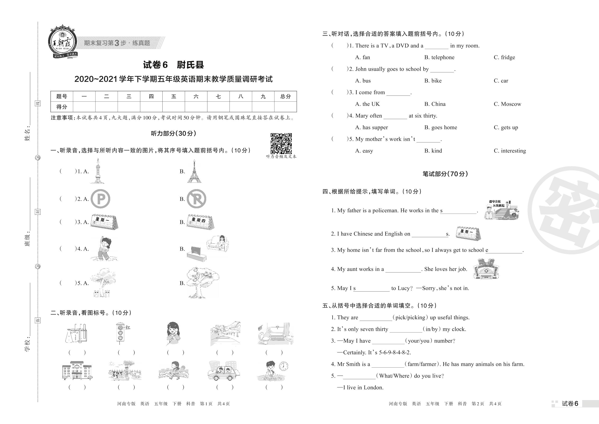 尉氏县2020~2021学年下学期五年级英语期末教学质量调研考试(科普版)【6】