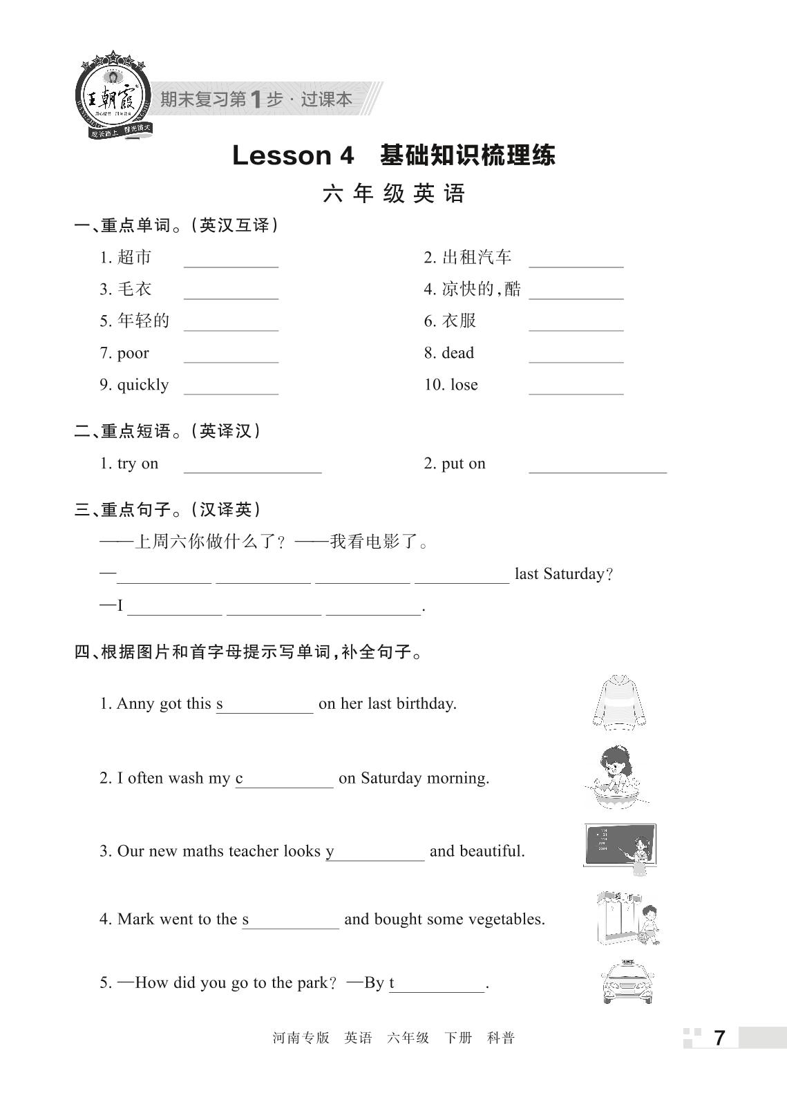 王朝霞期末过课本——Lessons 4 基础知识梳理练六年级下册英语(科普版)