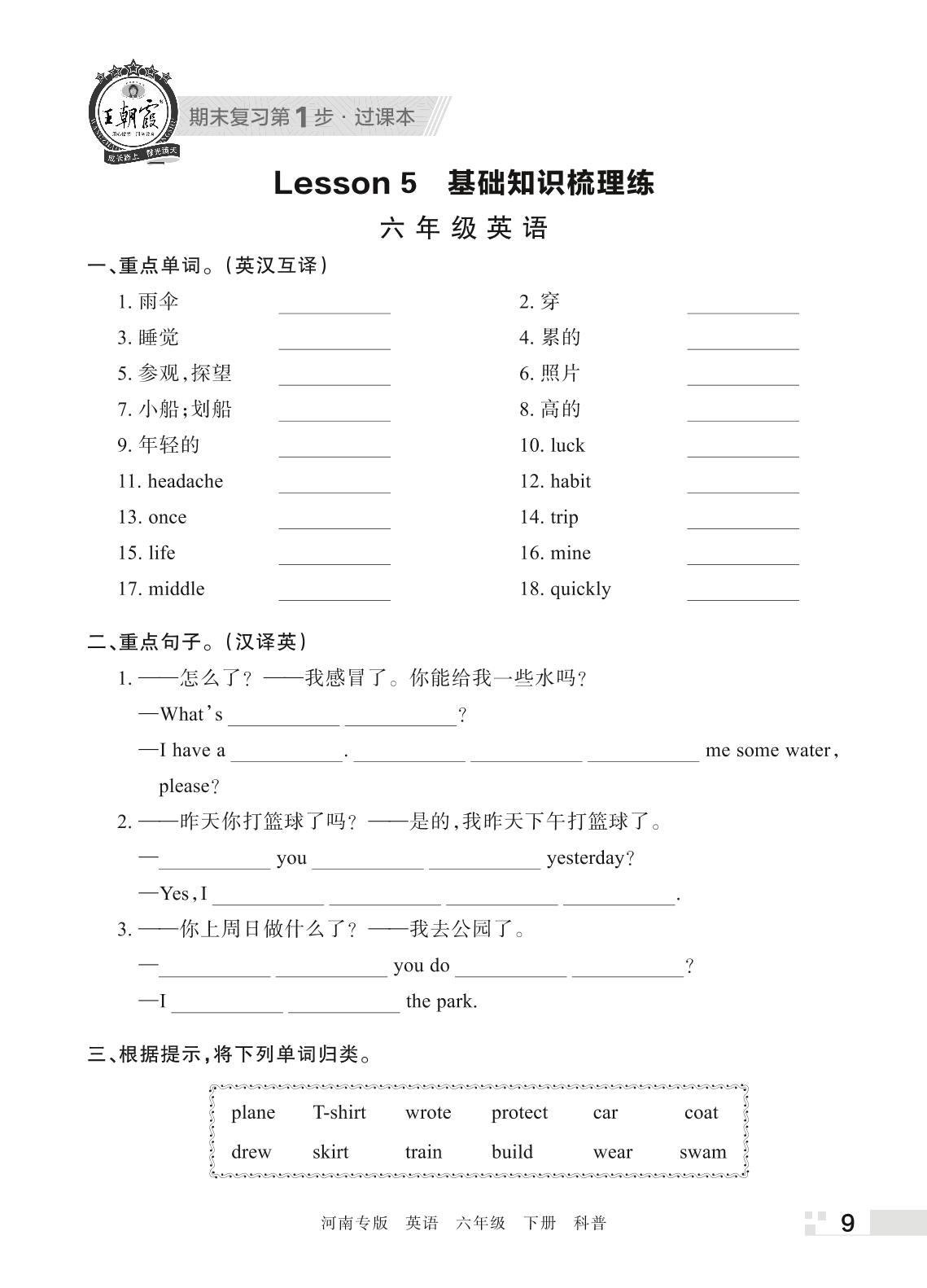 王朝霞期末过课本——Lessons 5 基础知识梳理练六年级下册英语(科普版)