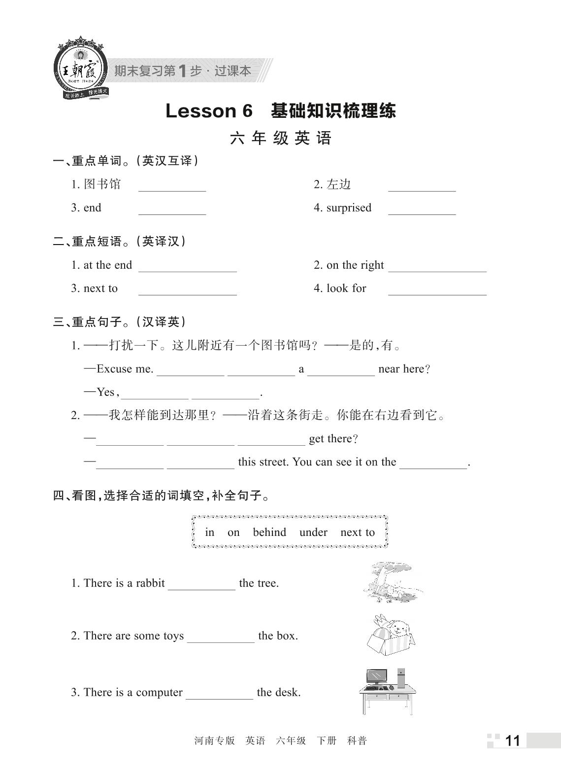 王朝霞期末过课本——Lessons 6 基础知识梳理练六年级下册英语(科普版)
