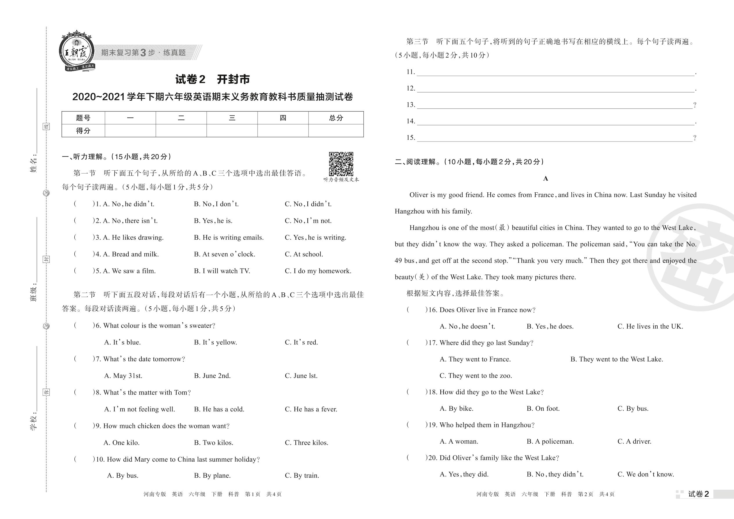开封市2020~2021学年下期六年级英语期末义务教育教科书质量抽测试卷(科普版)【2】