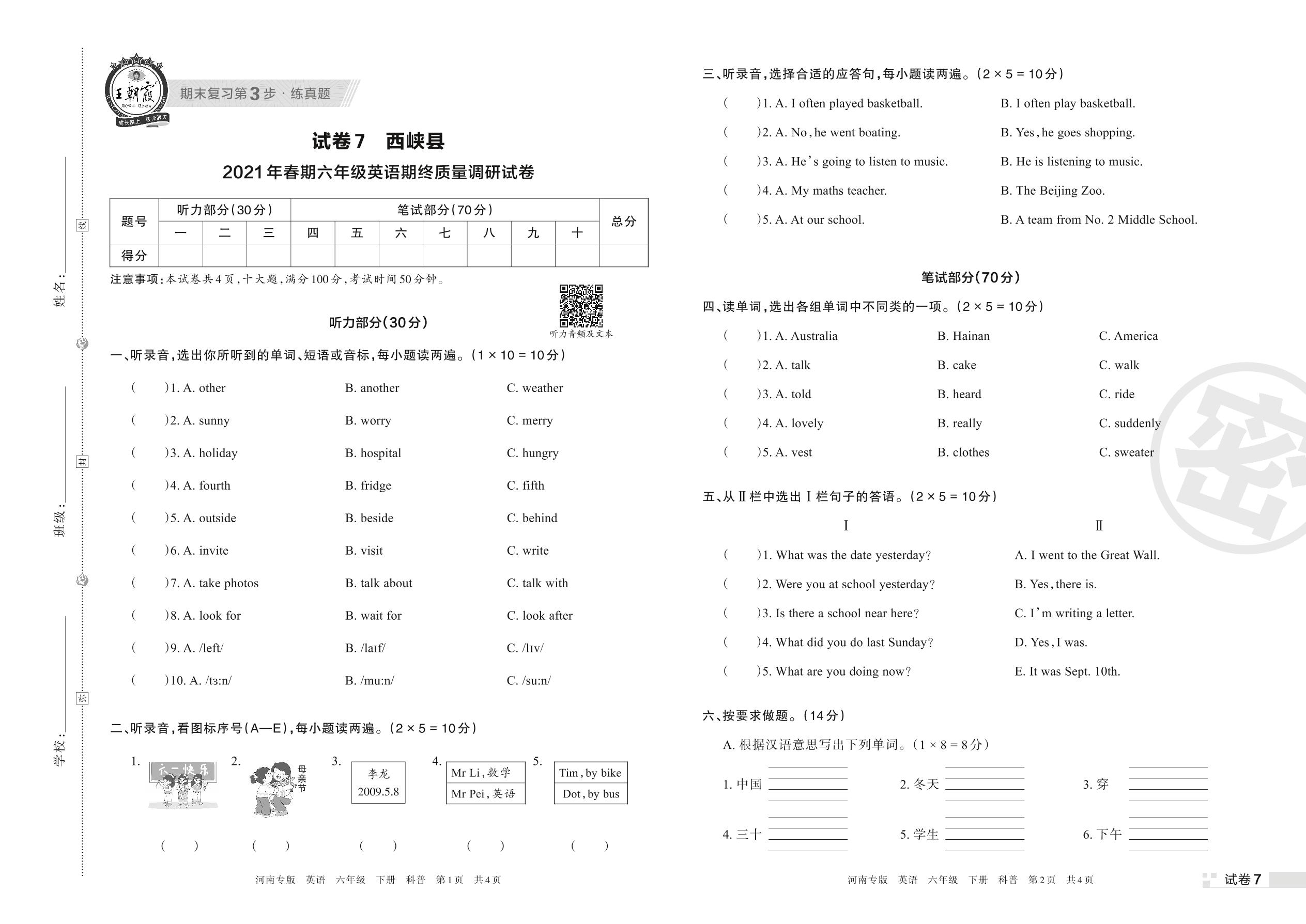 西峡县2021年春期六年级英语期终质量调研试卷(科普版)【7】
