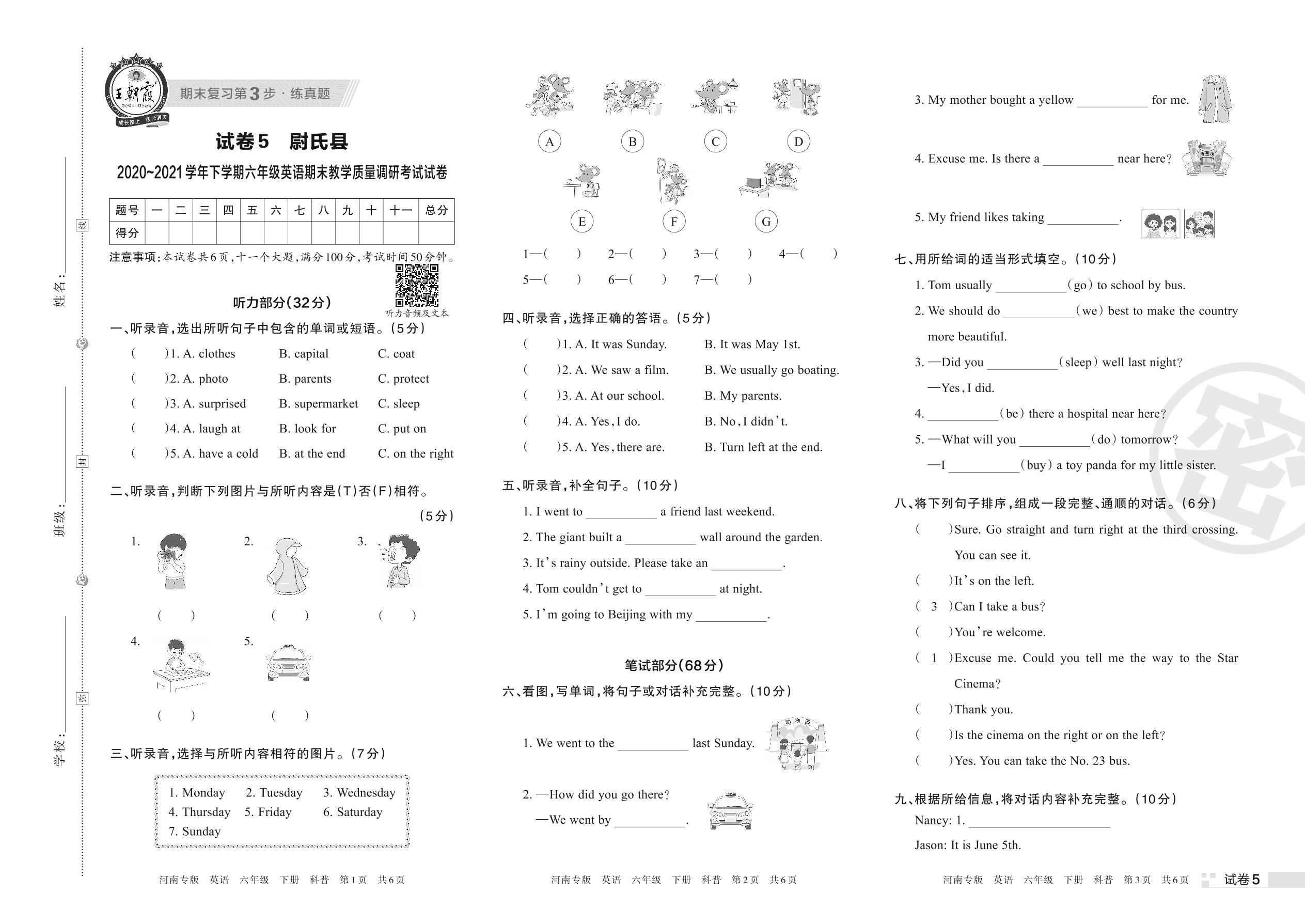 尉氏县2020~2021学年下学期六年级英语期末教学质量调研考试试卷(科普版)【5】