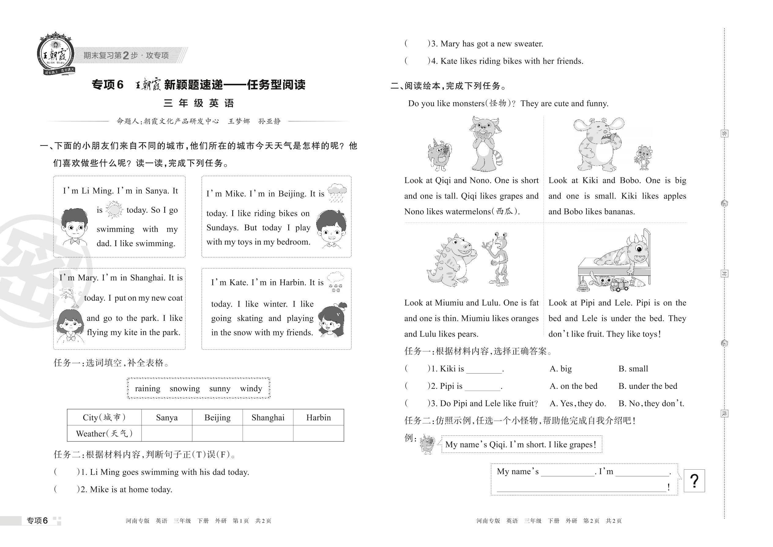 王朝霞期末专项卷——新颖题速递:任务型阅读三年级下册英语(外研版)【6】
