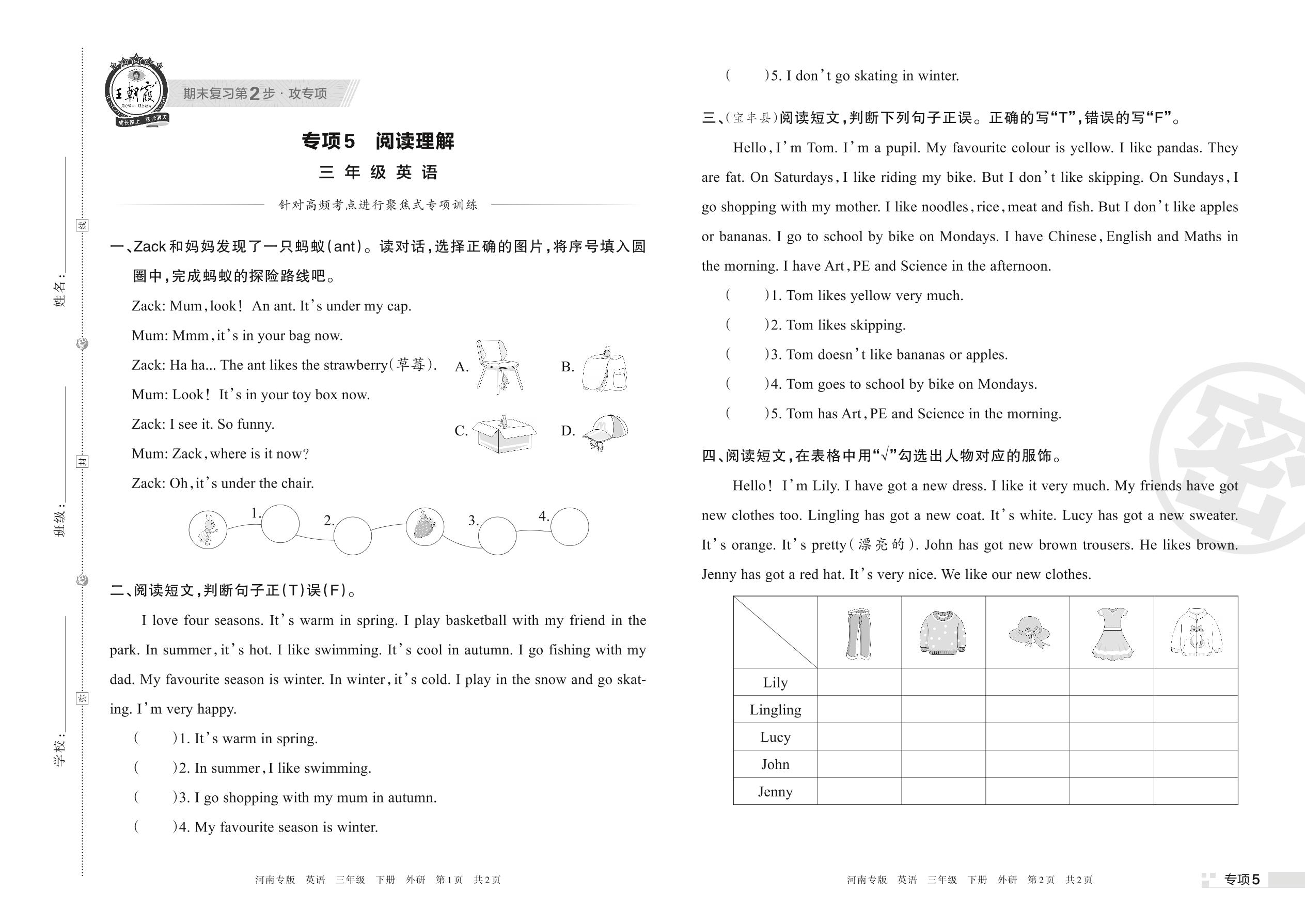 王朝霞期末专项卷——阅读理解三年级下册英语(外研版)【5】