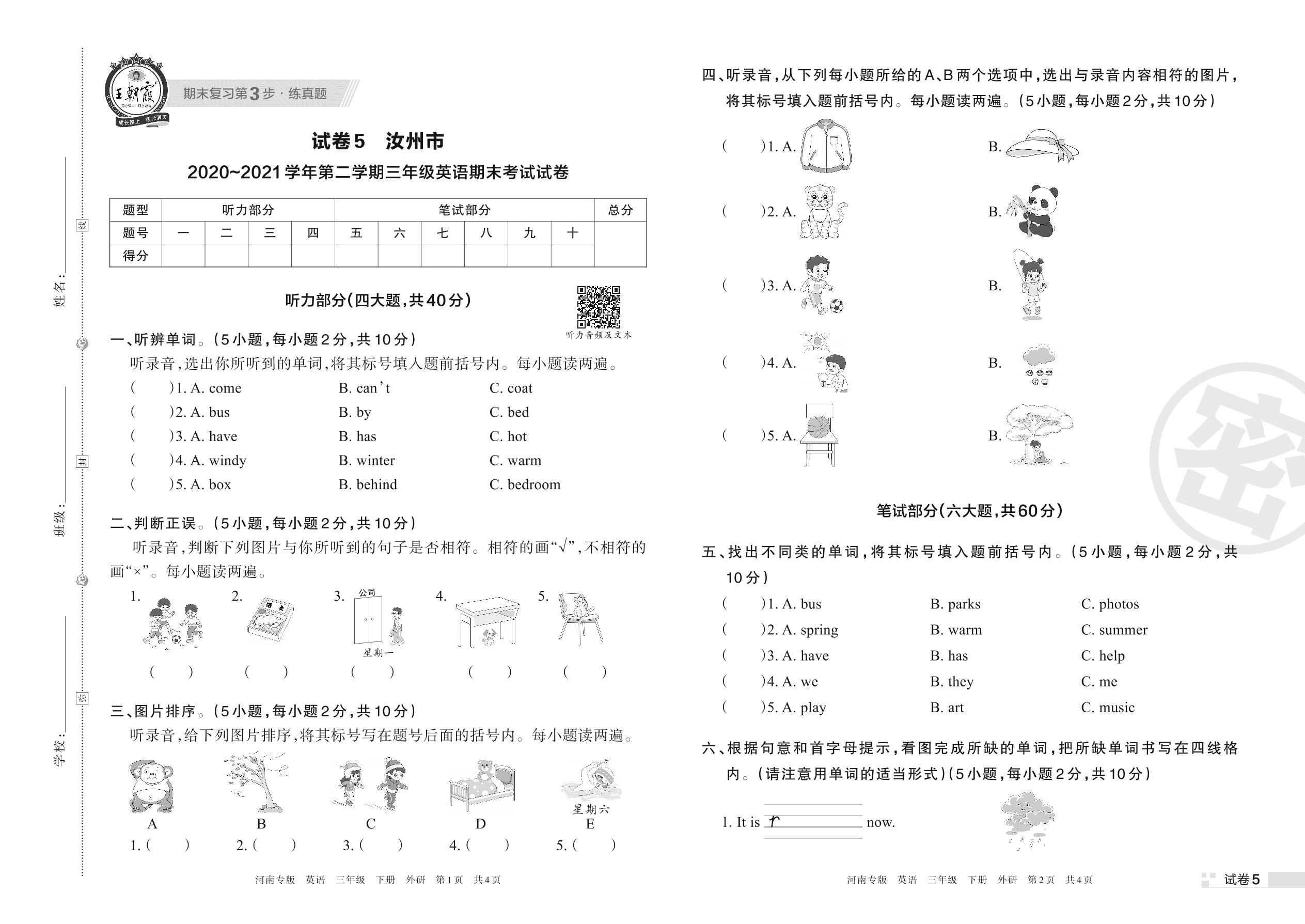 汝州市2020~2021学年第二学期三年级英语期末考试试卷(外研版)【5】