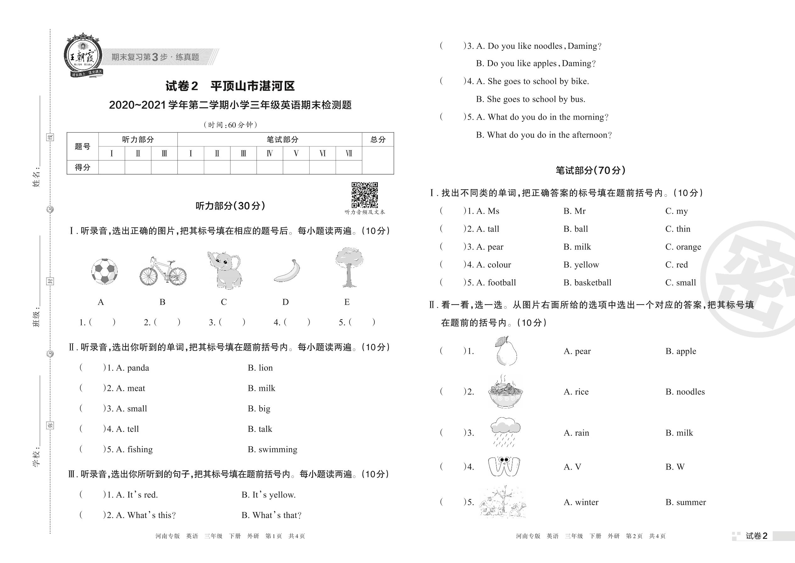 平顶山市湛河区2020~2021学年第二学期小学三年级英语期末检测题(外研版)【2】