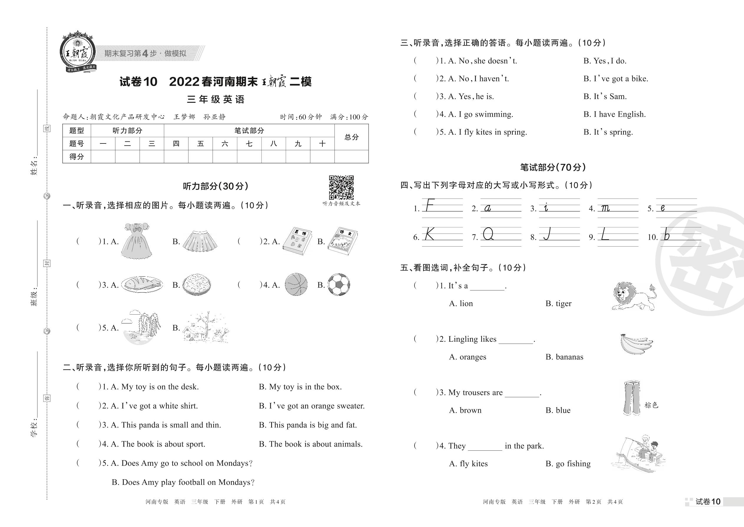 王朝霞期末模拟卷三年级下册英语(外研版)【10】